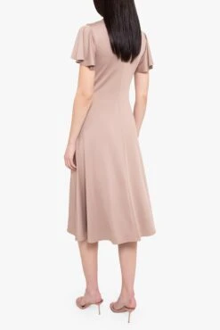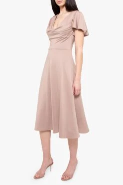 Elegant and feminine, midi dress features a draped cowl neckline and flutter sleeves for a soft, graceful look. The fitted bodice highlights the waist, flowing into a flared skirt for effortless movement. Perfect for weddings, special events, or daytime outings, it combines comfort and timeless style.