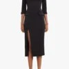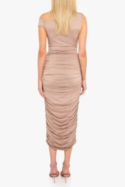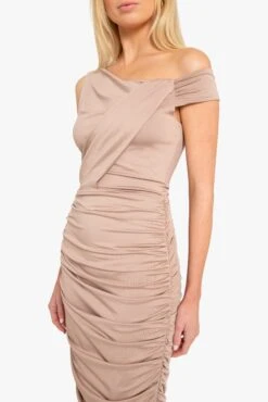 Designed to turn heads, made in sleek stretch knit jersey, this bodycon midi dress features an asymmetrical neckline with an off-shoulder draped bodice for a bold and stylish look. The shirred skirt enhances the figure-hugging fit while adding texture and movement. Perfect for a night out or special occasions, this dress blends statement details with a sleek silhouette.