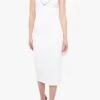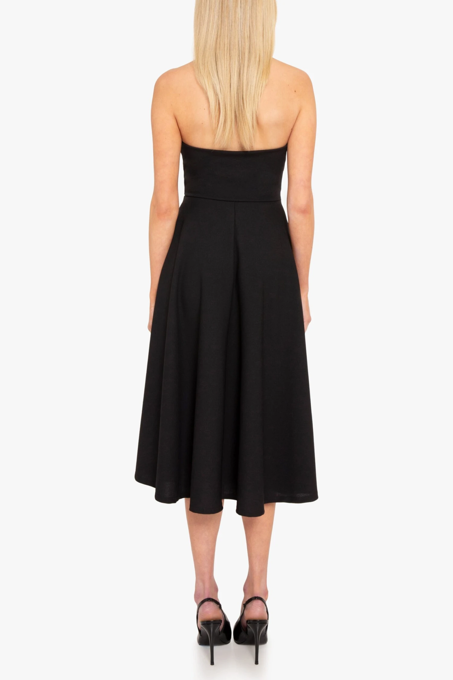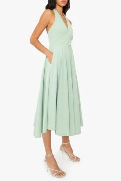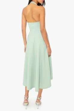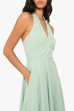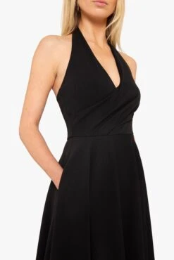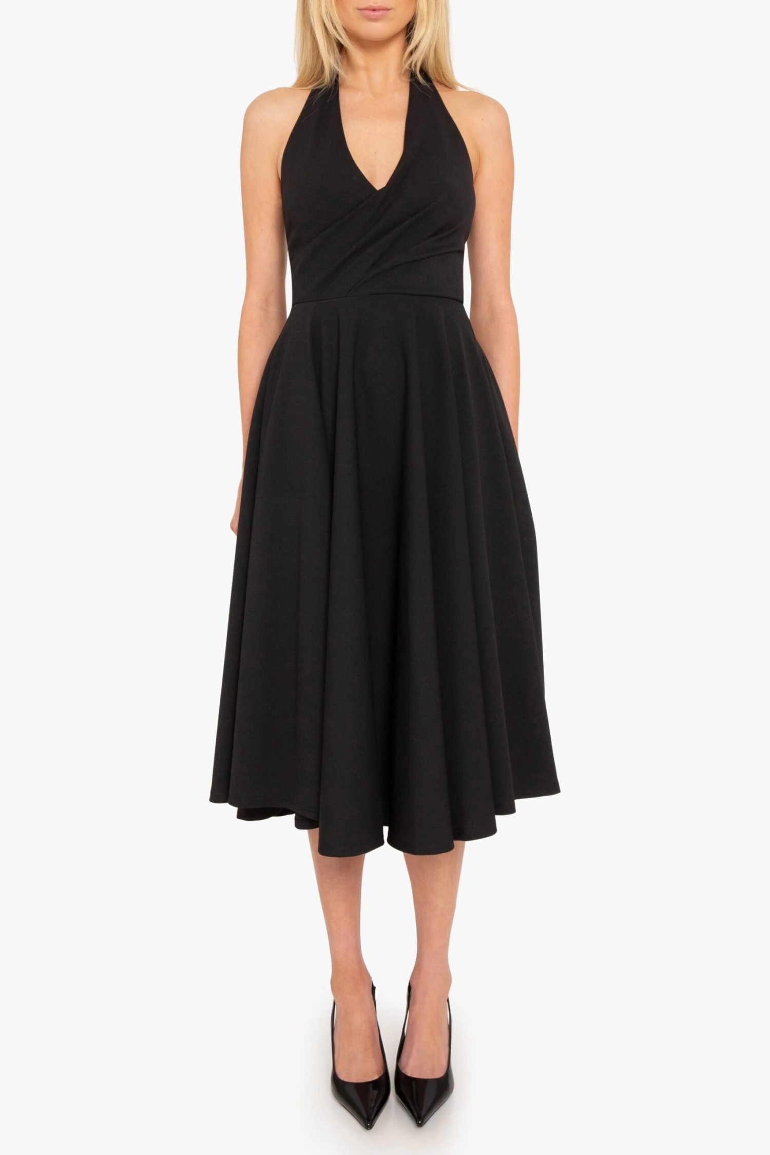 A timeless halter dress with a modern edge. Designed with a wrap V-neck bodice and delicate draping in a stretch knit crepe, it features a self-covered button closure at the back of the neck. The full circle skirt adds movement, while side seam pockets keep it effortlessly functional.