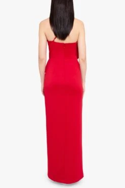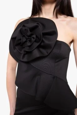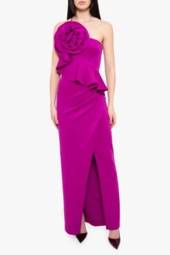 The Augustina Gown is the epitome of modern elegance, making it a perfect choice for formal occasions. It features an asymmetrical one-shoulder silhouette adorned by an oversized rosette detail for a bold and feminine touch. Cascading ruffle enhances its graceful design, while the fitted bodice and thigh-high slit add a sultry edge. Crafted from stretch fabric, it ensures both comfort and a flattering fit.