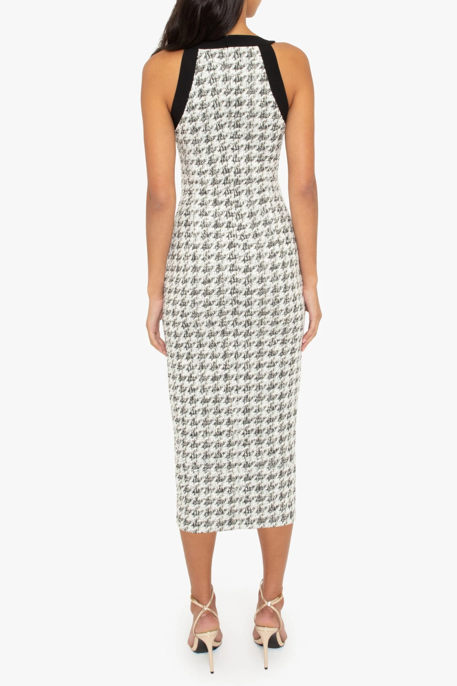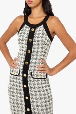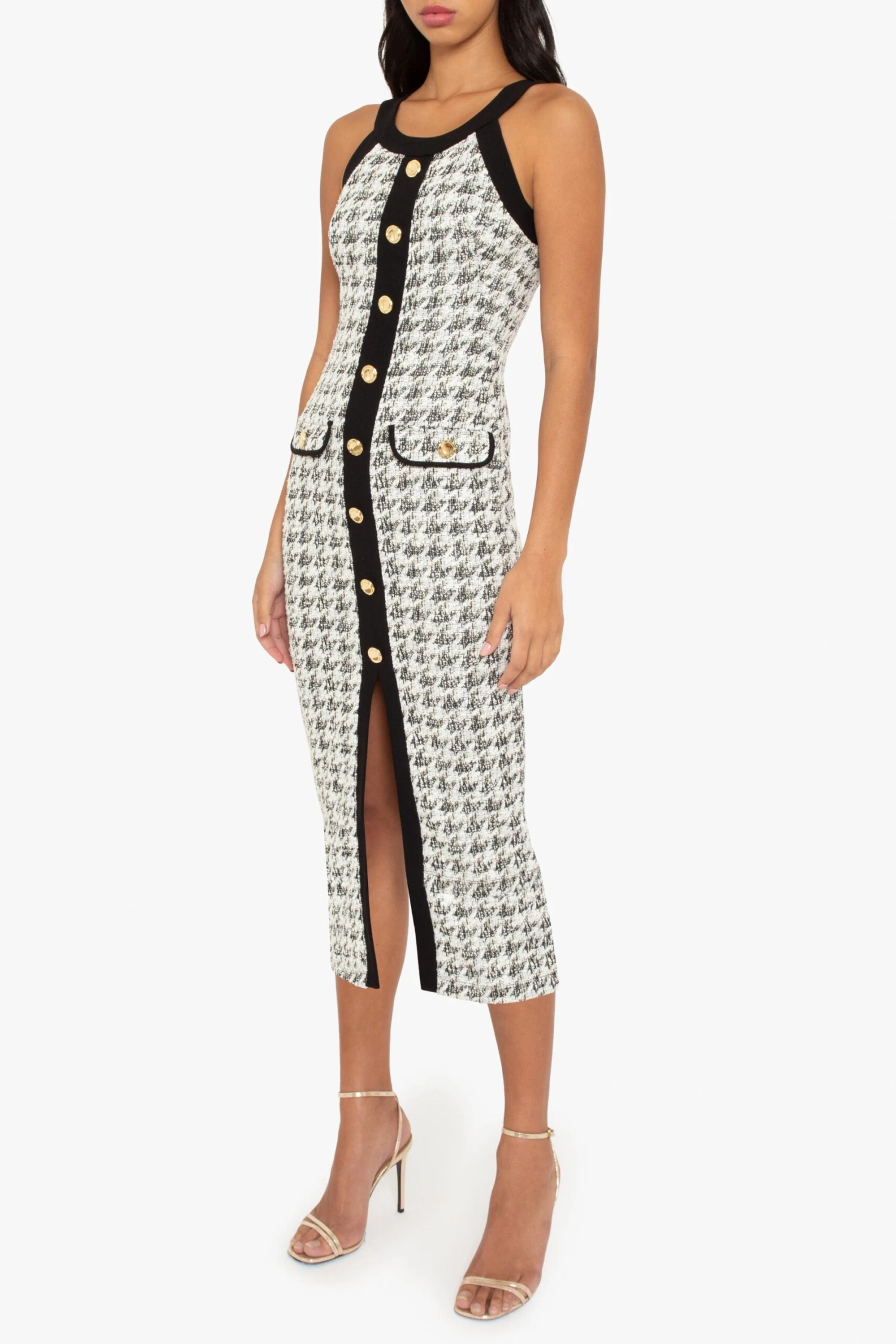 The Aura Midi Dress combines structure and detail for a polished look. The jewel neckline and sleeveless silhouette create a clean, modern shape, while the center front row of shiny gold buttons adds a statement touch. Faux pockets with contrasting piping lend a tailored feel, and a center front slit allows for ease of movement. The fitted column silhouette enhances the figure, making this a versatile piece for both professional and social occasions.