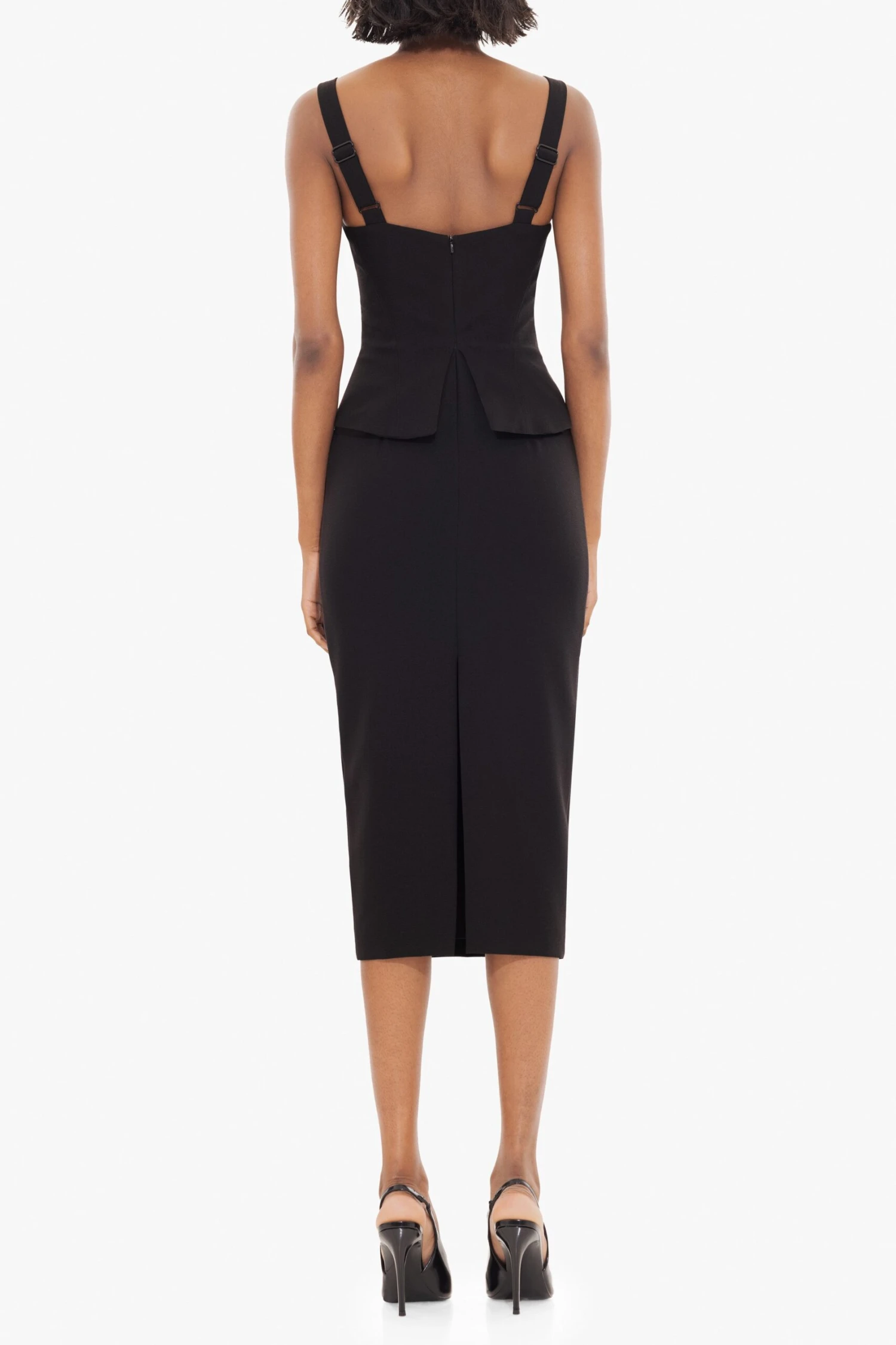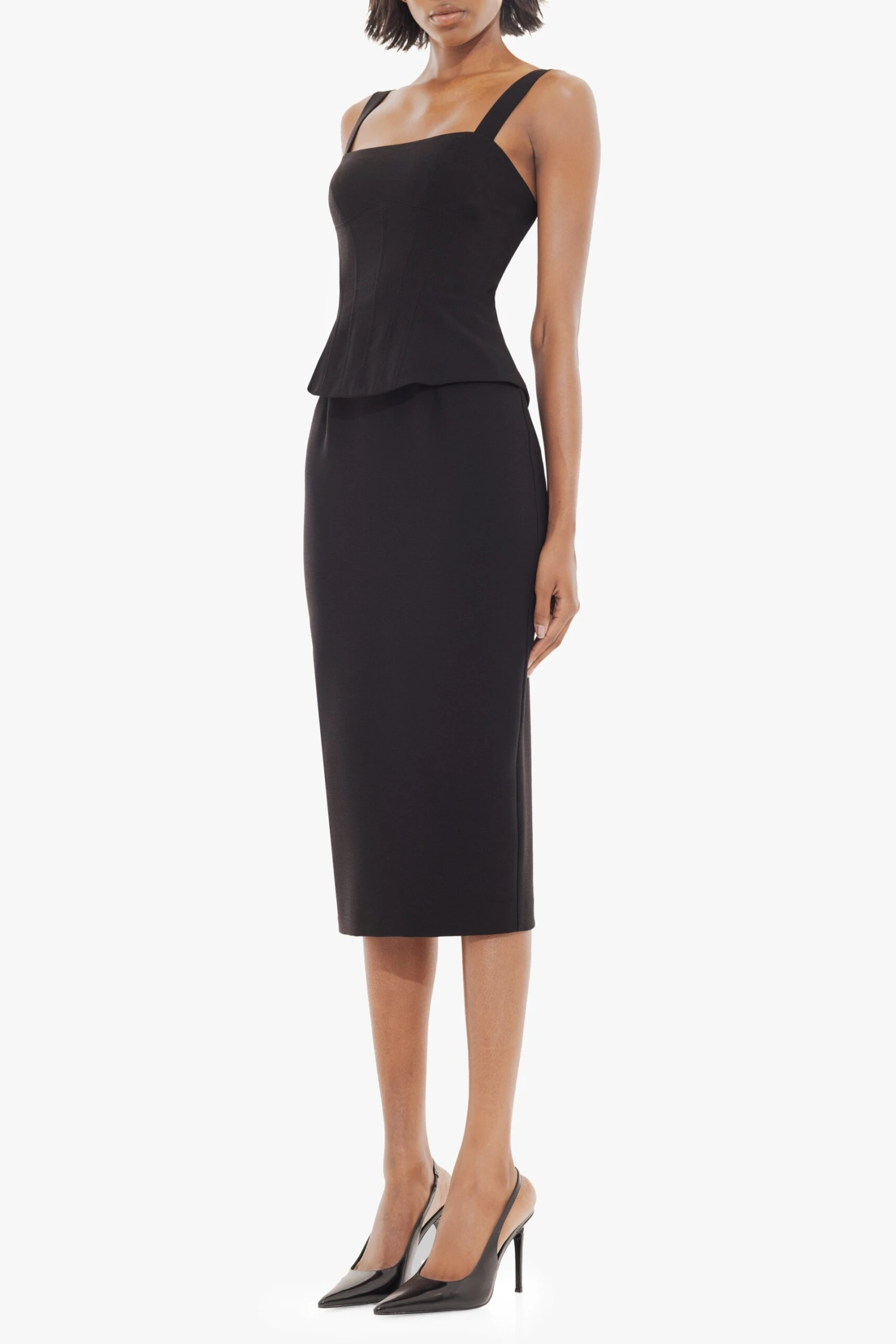 The Beverly Midi Dress brings structure and softness together with a square neckline and contoured bodice. The adjustable shoulder straps and topstitched corset seaming offer a precise fit, while the pencil skirt adds a timeless finish. It’s crafted in stretch crepe for comfort and shape retention.