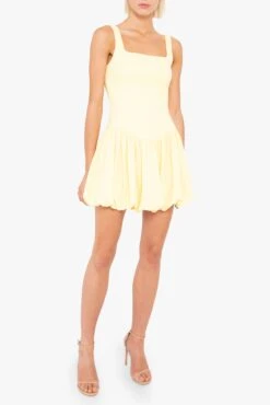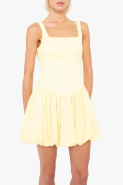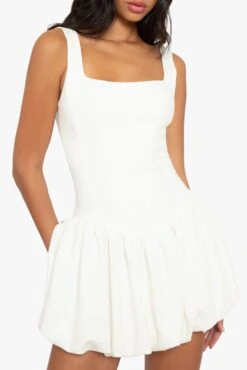 The Birdie Mini Dress is crafted in stretch super loft woven, this mini dress is all about structure and movement. It features a crisp square neckline and a corset-seamed bodice that creates a sculpted fit. The drop waist flows into a playful bubble skirt, adding volume and personality to the look. A go-to piece for when you want something fun, but with a sharp finish.