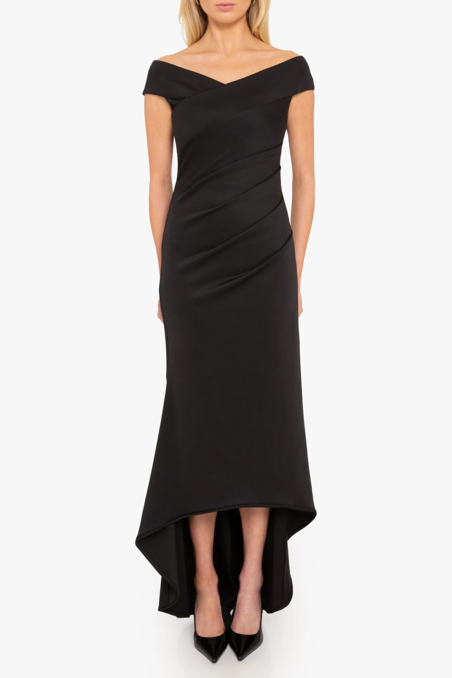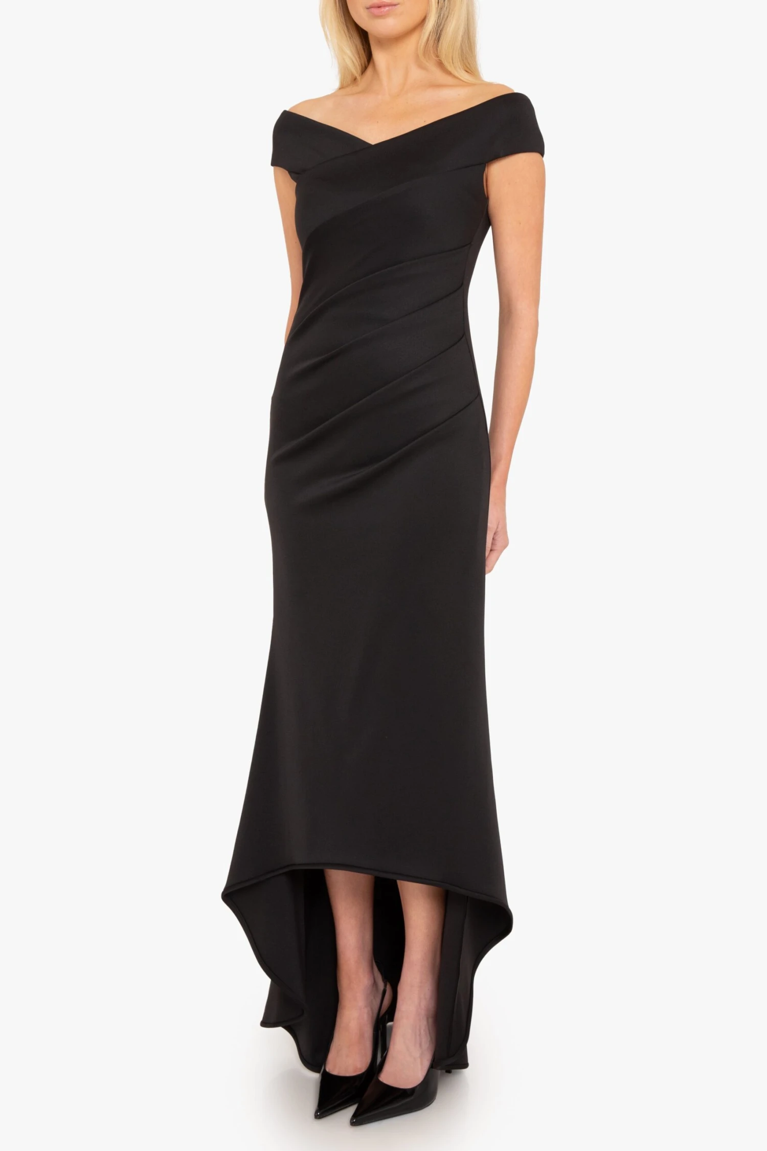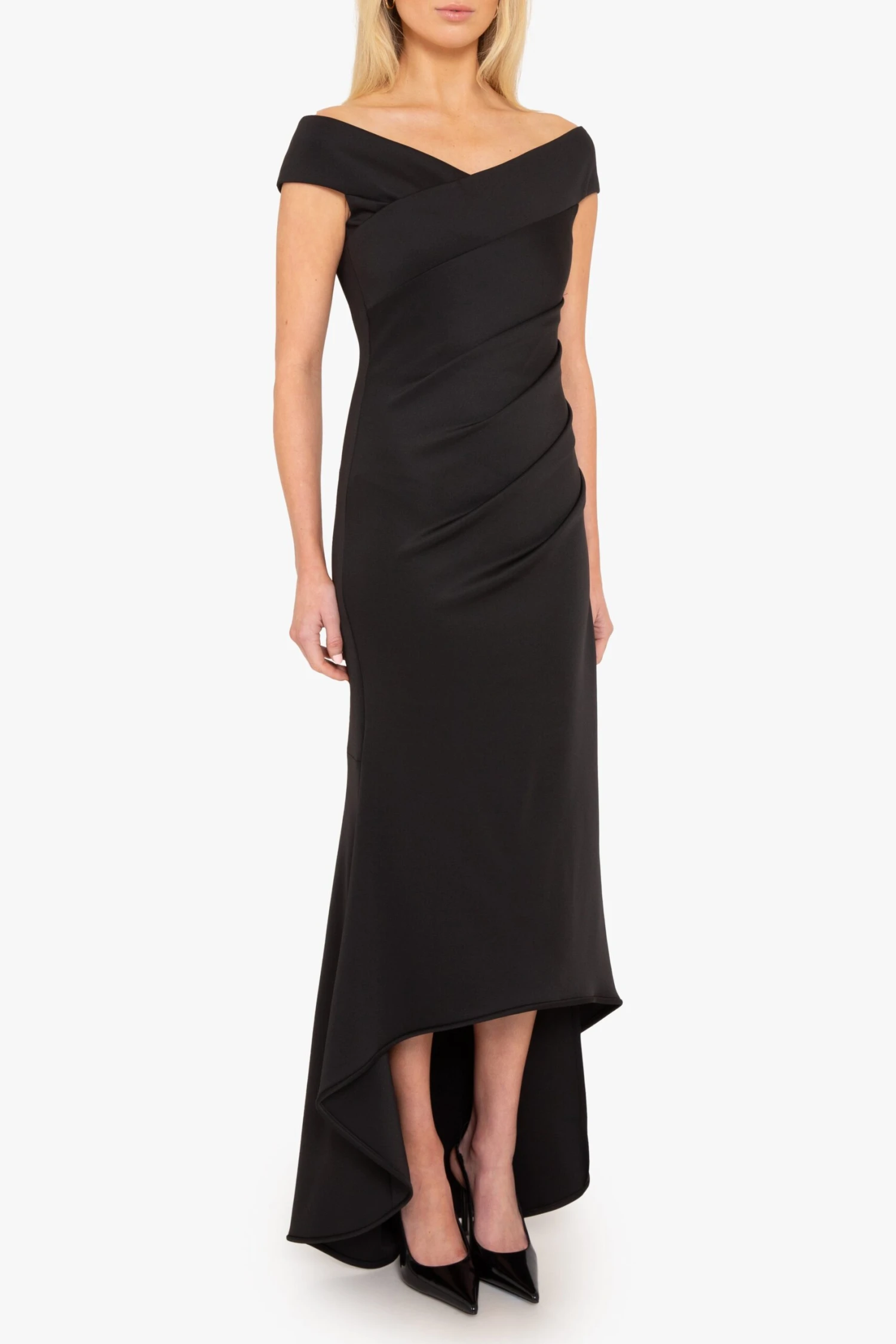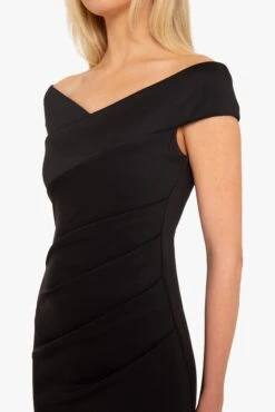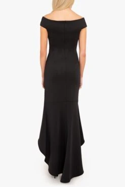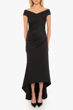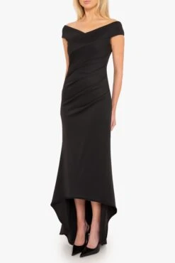 The Brielle Gown features an off-shoulder V-neckline that enhances the neckline, while subtle tucks along the left side seam create a flattering, contoured fit. The bodycon silhouette made from a stretch knit fabric gracefully transitions into a dramatic high-low fishtail hem, adding movement to every step.