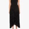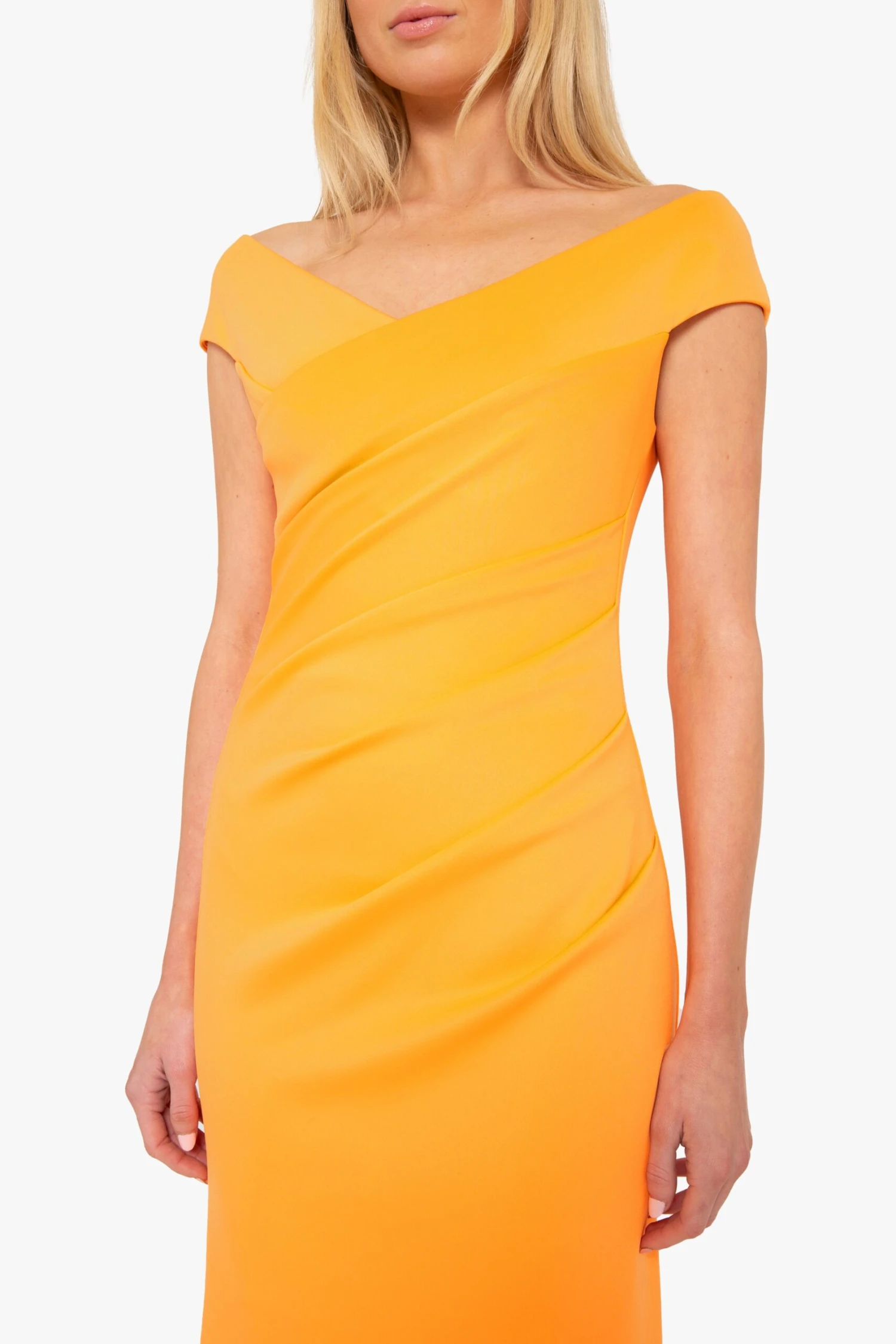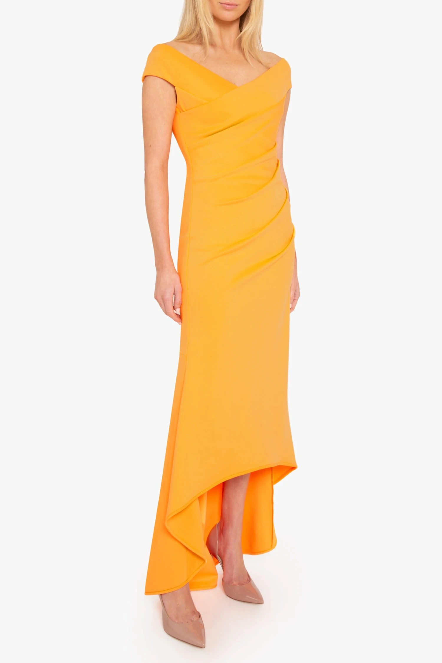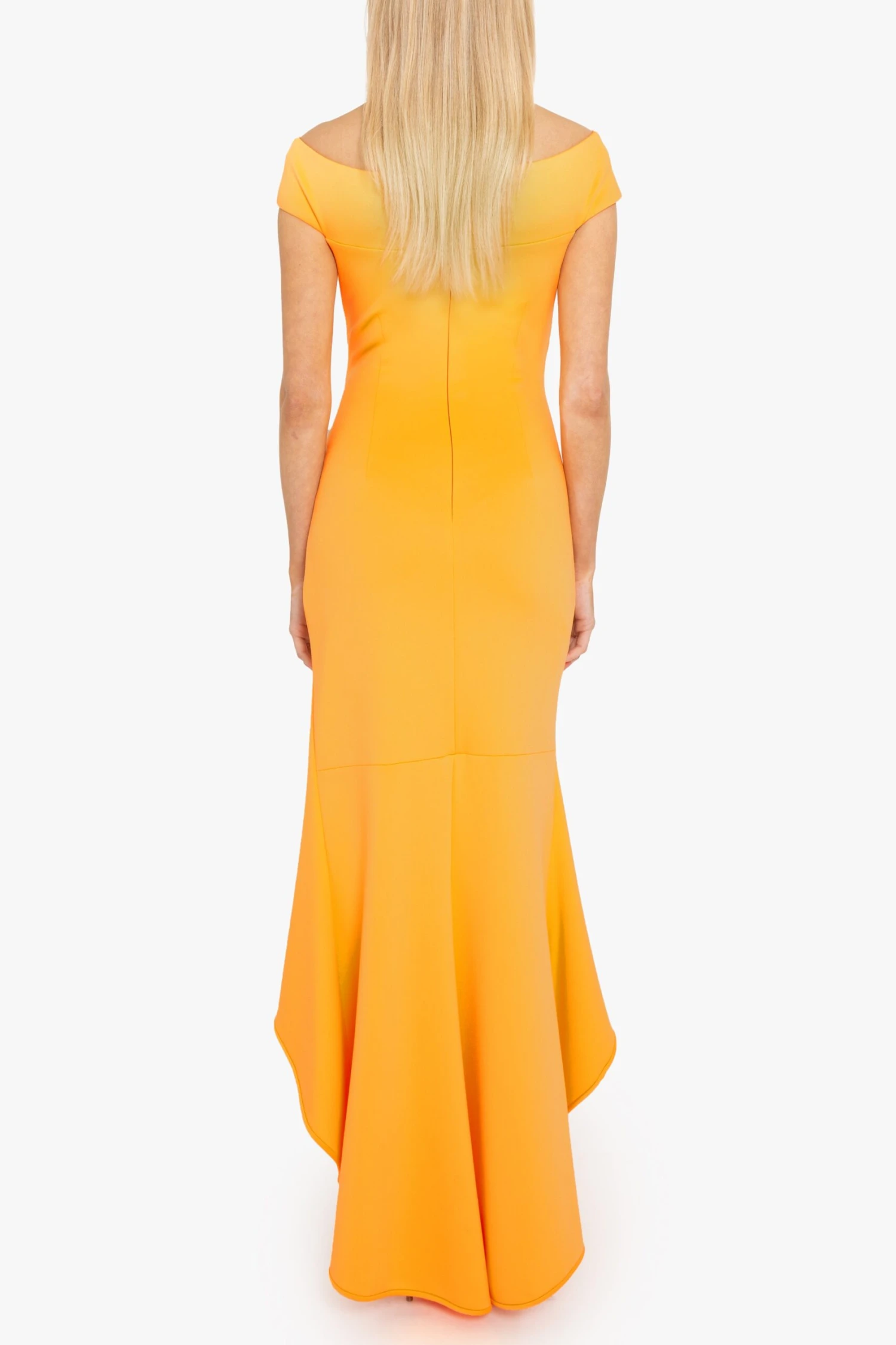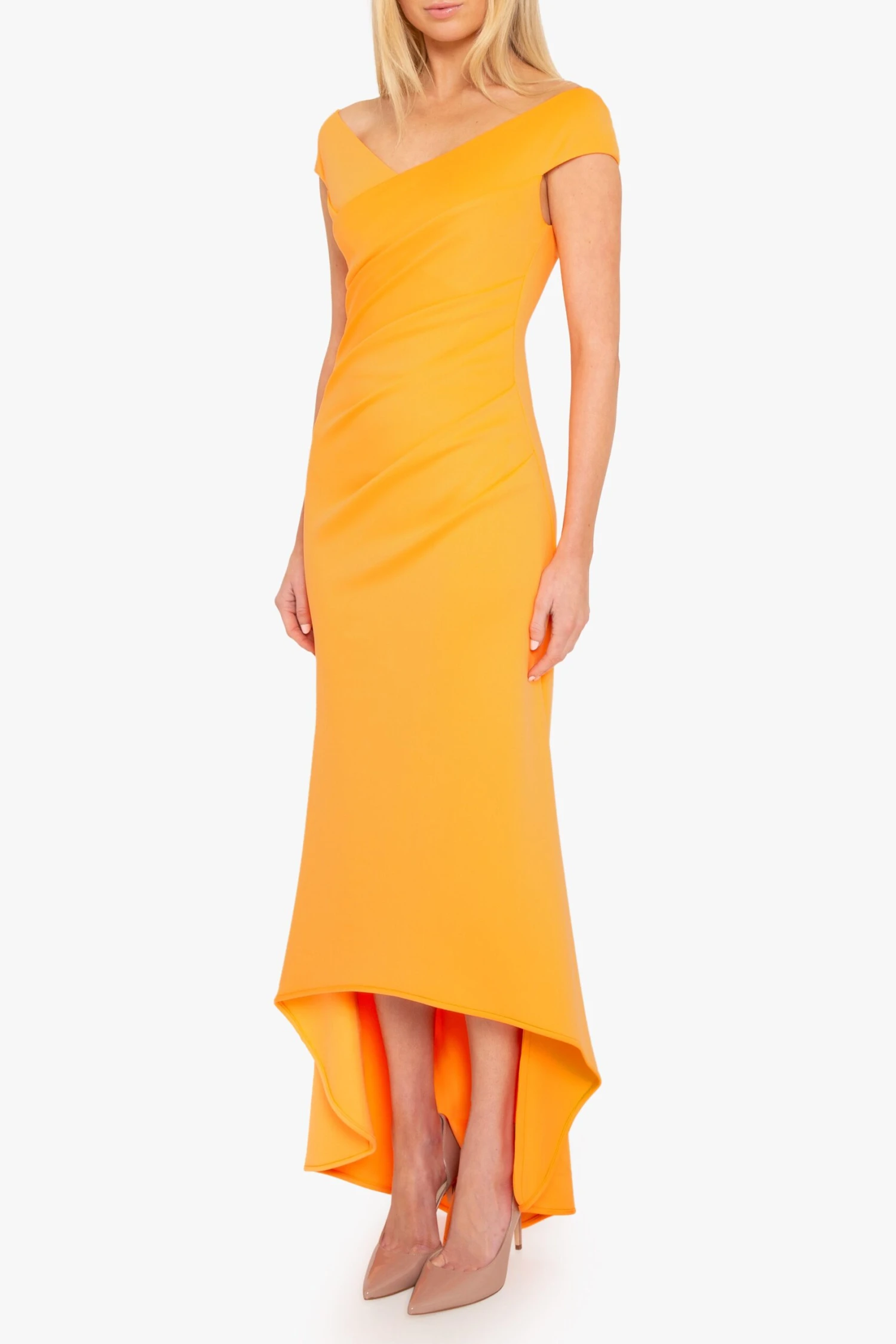 The Brielle Gown features an off-shoulder V-neckline that enhances the neckline, while subtle tucks along the left side seam create a flattering, contoured fit. The bodycon silhouette made from a stretch knit fabric gracefully transitions into a dramatic high-low fishtail hem, adding movement to every step.