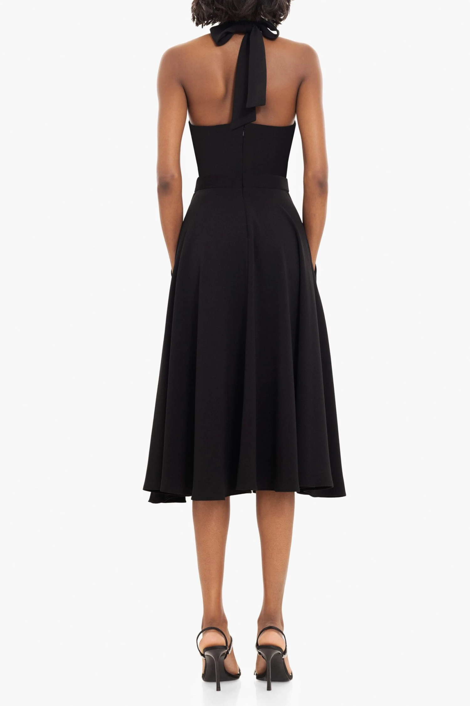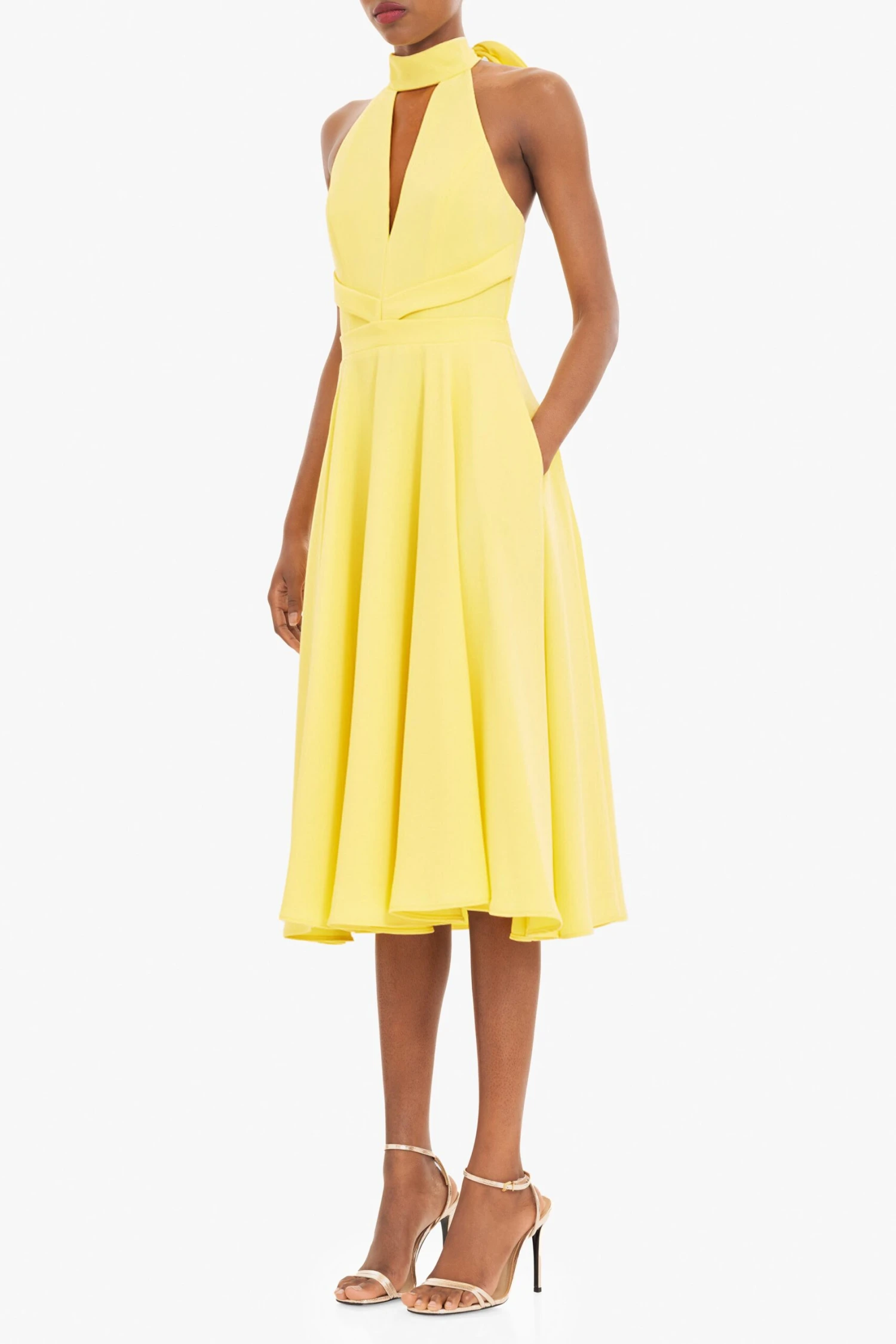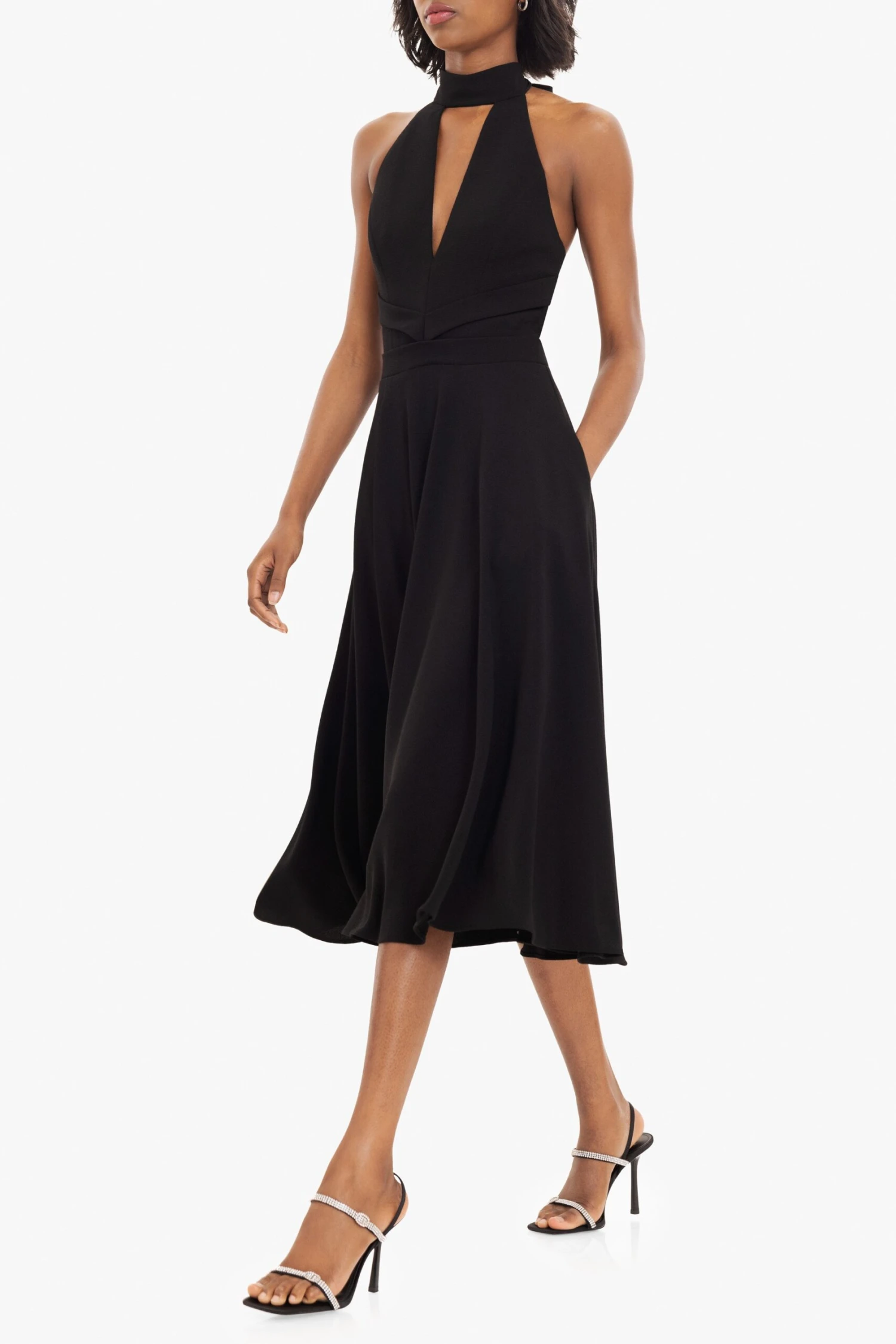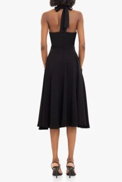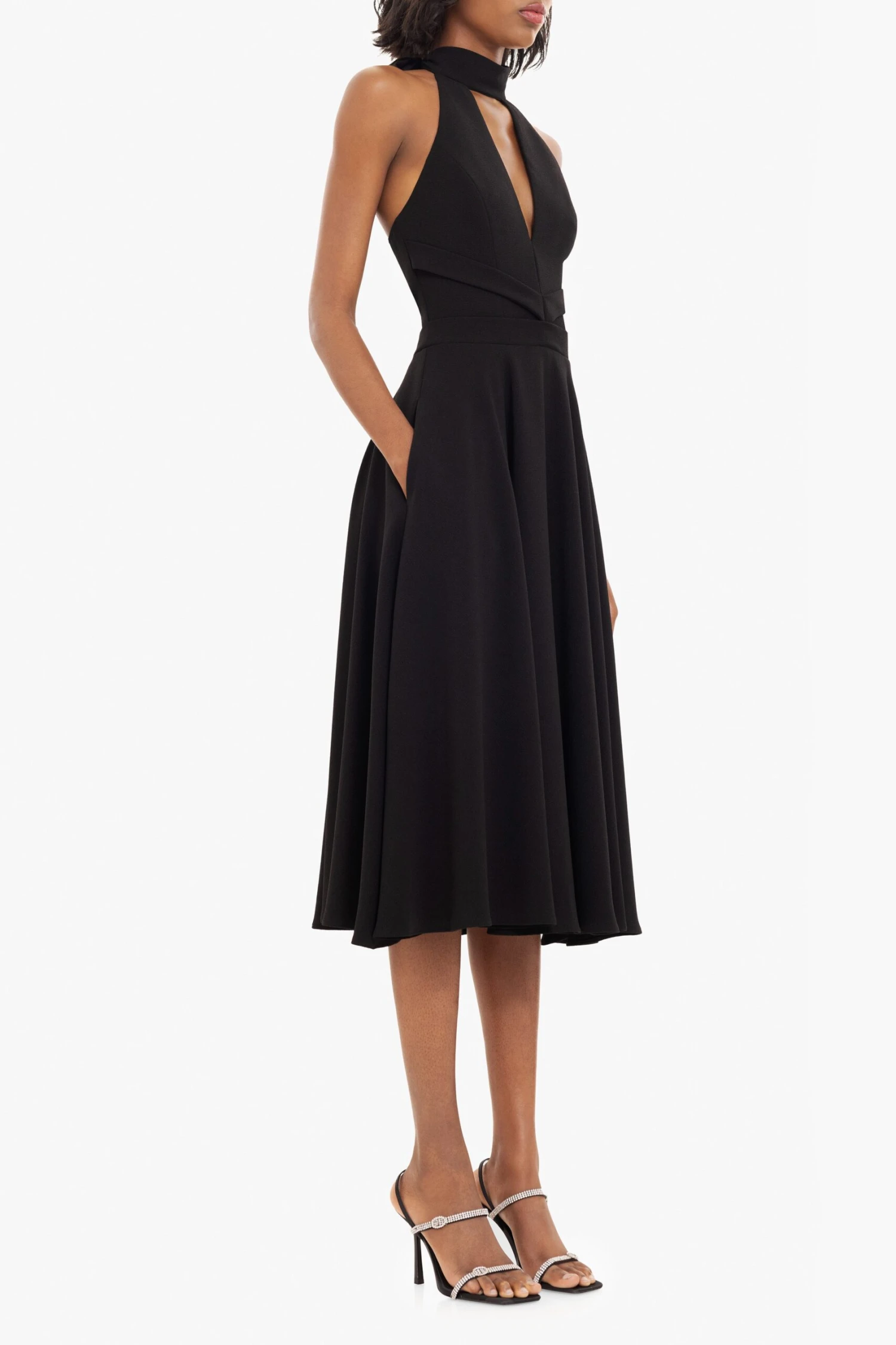 The Caelith Midi Dress is designed to highlight the waist and flatter the neckline. The deep V-neck is complemented by a sleek mock neck cutout and ties at the back for an adjustable fit. A full midi skirt adds graceful movement, while discreet inseam pockets offer everyday ease. Perfect for evening soirées or elevated daytime events.