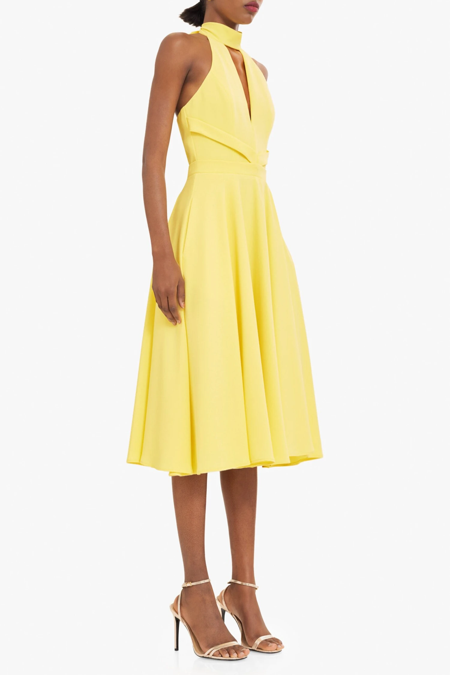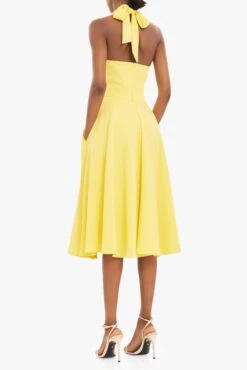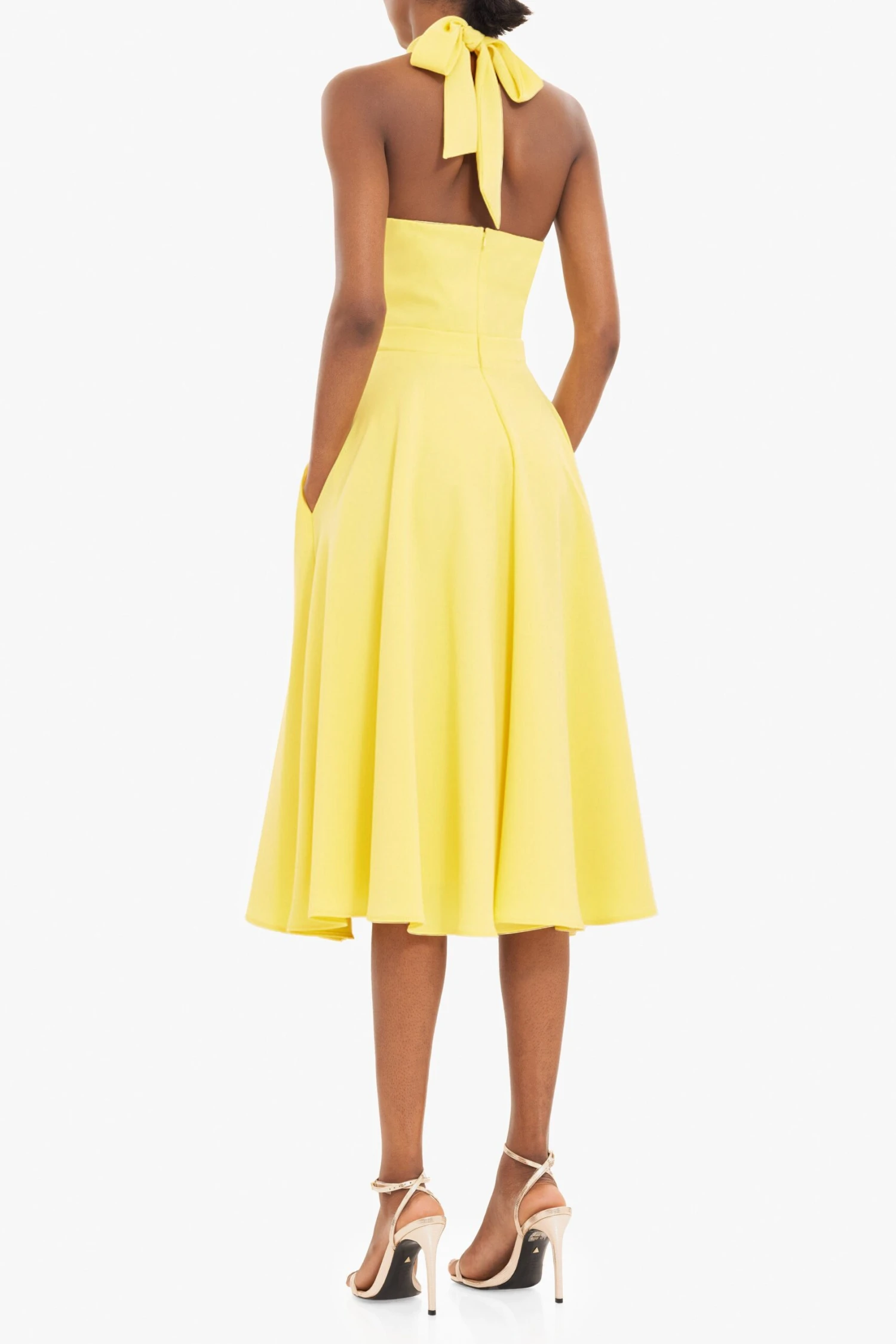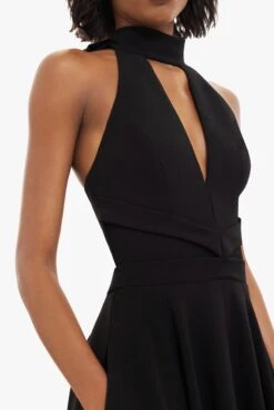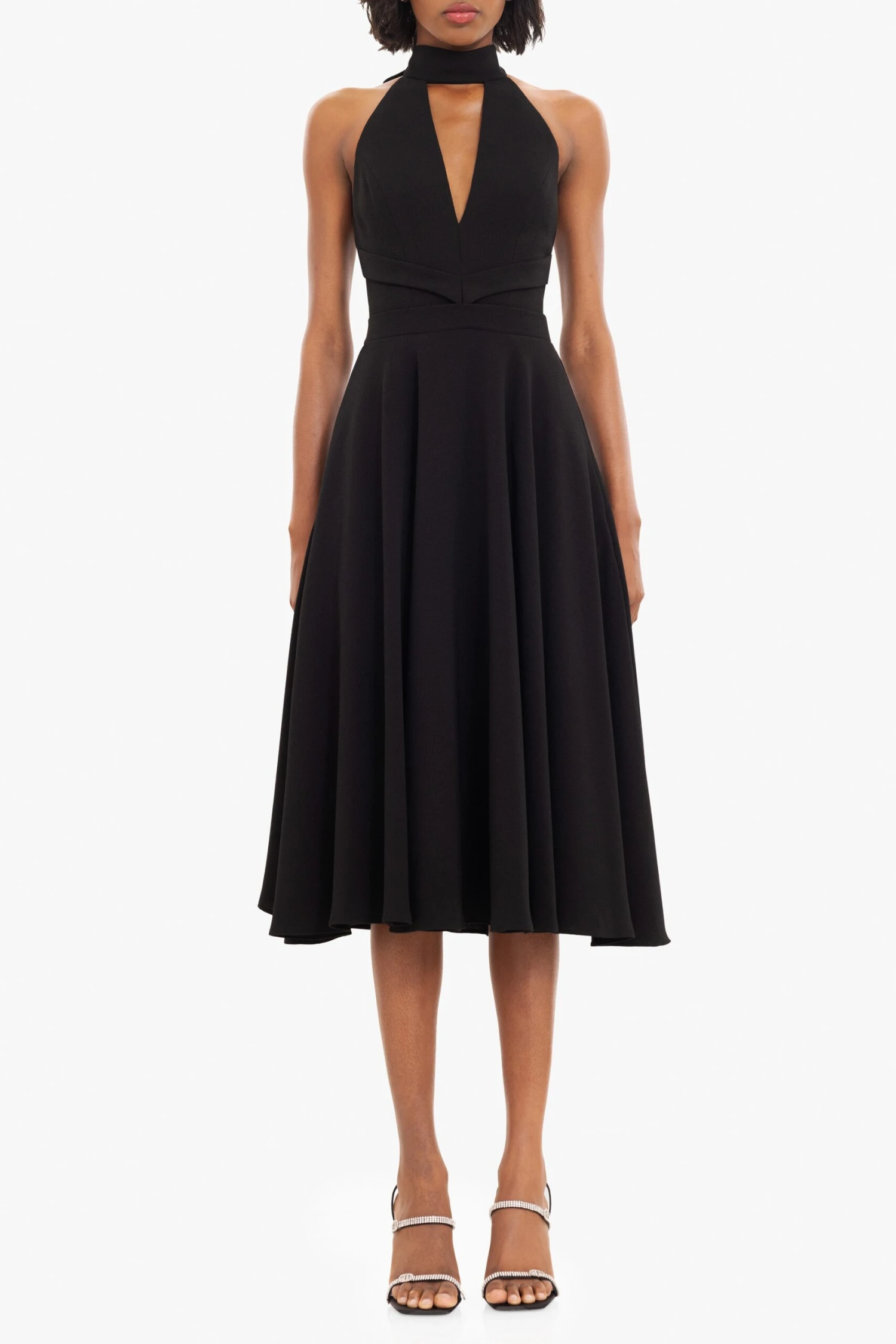 The Caelith Midi Dress is designed to highlight the waist and flatter the neckline. The deep V-neck is complemented by a sleek mock neck cutout and ties at the back for an adjustable fit. A full midi skirt adds graceful movement, while discreet inseam pockets offer everyday ease. Perfect for evening soirées or elevated daytime events.