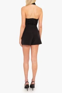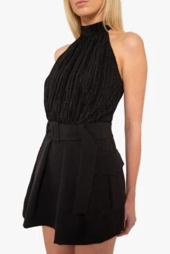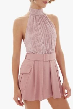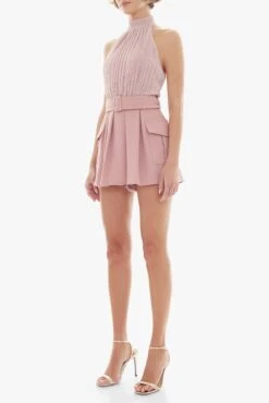 The Dara playsuit features a mockneck halter design with a shirred bodice that adds texture and structure. A wide self-belt with a rectangular self-covered buckle cinches the waist, creating a flattering silhouette. Two cargo pockets add a functional yet fashion-forward touch, while the flared shorts bring movement and ease to the look.