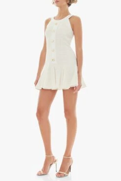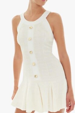 The Didi Mini Dress is a flirty silhouette crafted in a textured sequin bouclé knit that catches the light with every step. The crew halter neckline and sleeveless bodice are framed with contrast trim, leading to a princess-seamed body that flatters the shape. Bold gold buttons run down the center front placket for a tailored touch, while a flared godet hem adds playful movement. Finished with a hidden back zipper for a seamless fit.