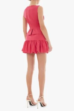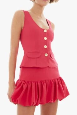 The Enid Mini is a two-piece-inspired silhouette that features a fitted vest-style top with a deep U-neckline, sculpted seams, and bold gold buttons down the center. Two functional flap pockets nod to classic suiting, while the bubble mini skirt adds volume and movement. Finished with a hidden back zipper for a smooth, streamlined fit.