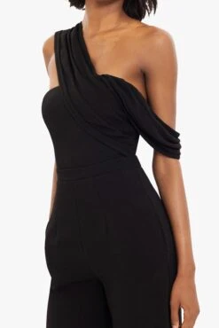 The Evelina Jumpsuit blends fluid lines with sharp structure. Designed in crepe back satin, it features a one-shoulder neckline with a draped overlay sleeve that falls softly over one arm, creating a sculptural effect. The bodice is clean and fitted, while the straight-leg pants are tailored with side slits for added movement. Inseam pockets add functionality without interrupting the silhouette. A hidden zipper at the back ensures a seamless finish.
