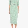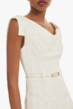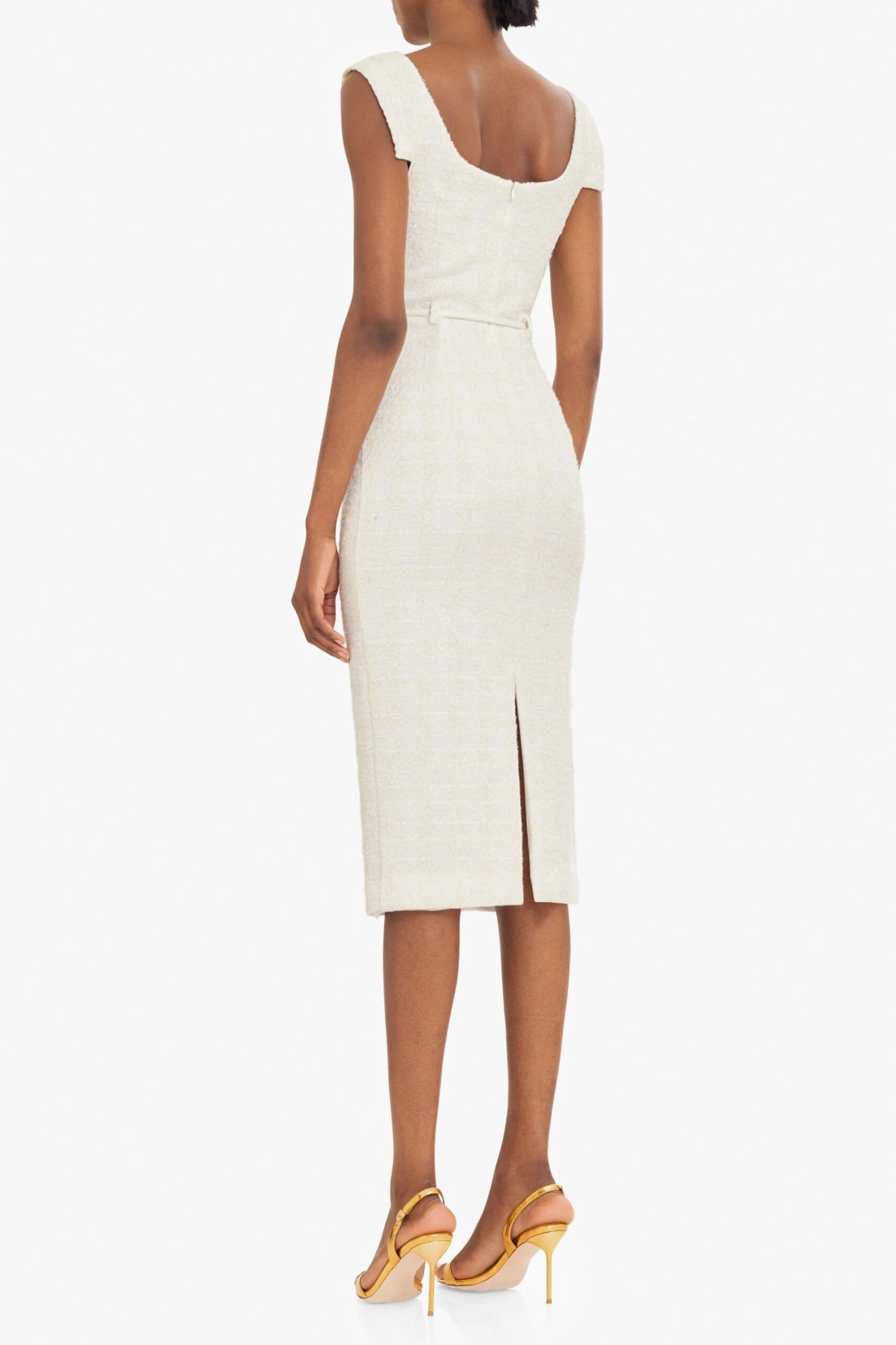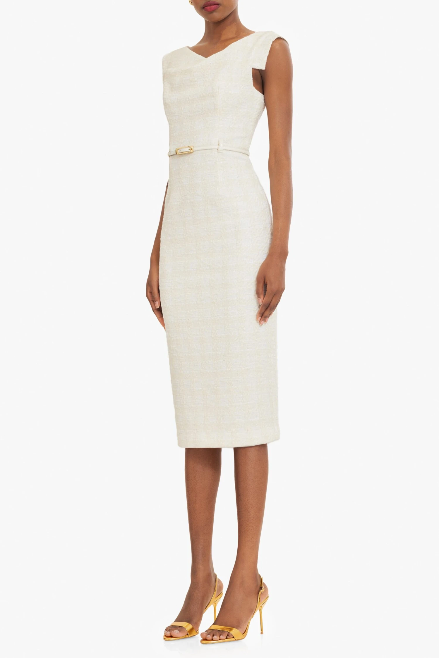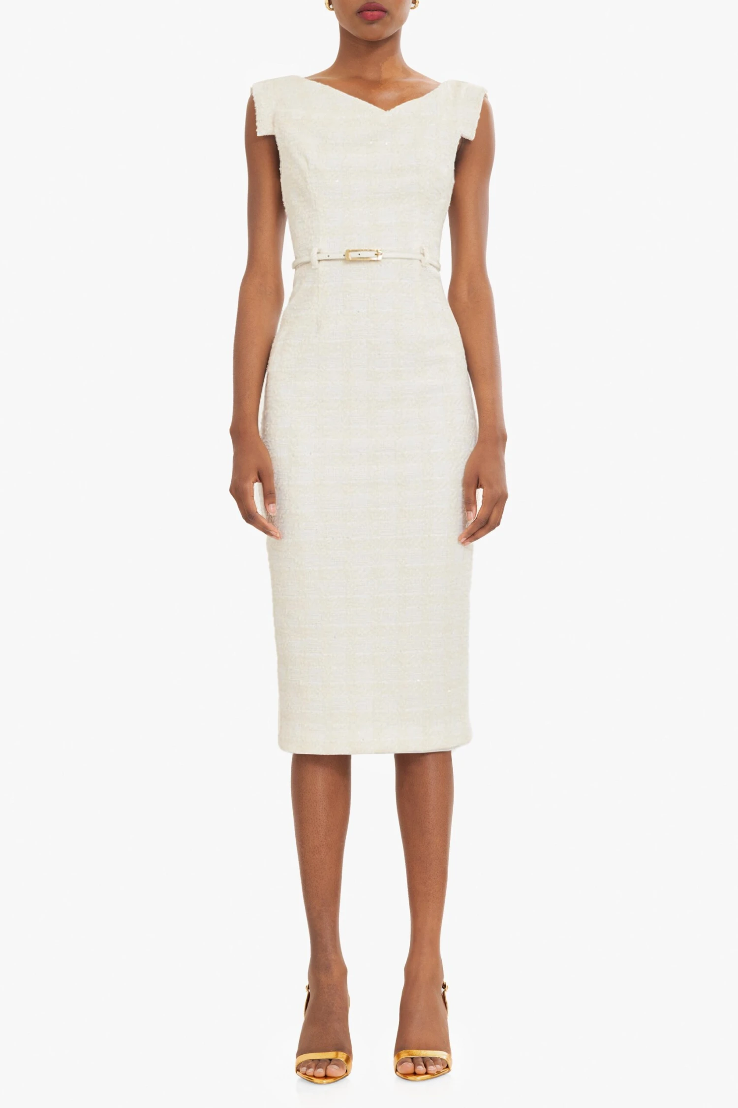 The Jackie O Midi Dress is crafted from a textured sequin boucle knit, this dress blends refined structure with a soft touch. The draped neckline and tab sleeves add a sculptural finish to the tailored bodice, while the genuine leather belt defines the waist. A center back slit allows for ease of movement, perfectly complementing the sleek midi silhouette. Designed to fit close to the body, this piece is both polished and versatile.