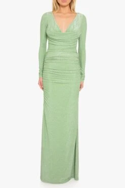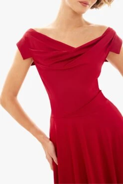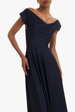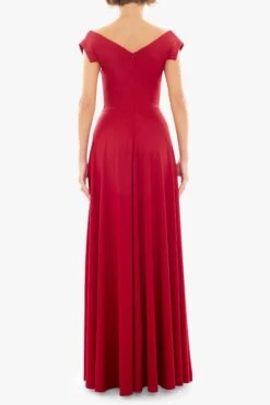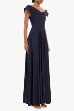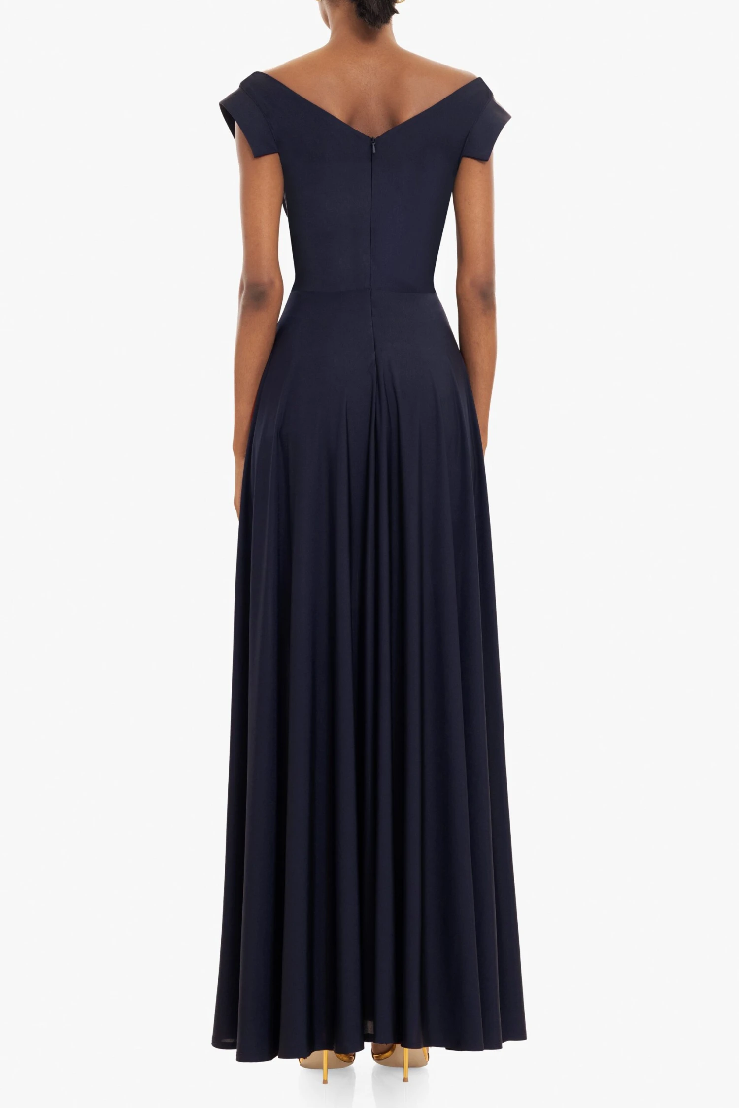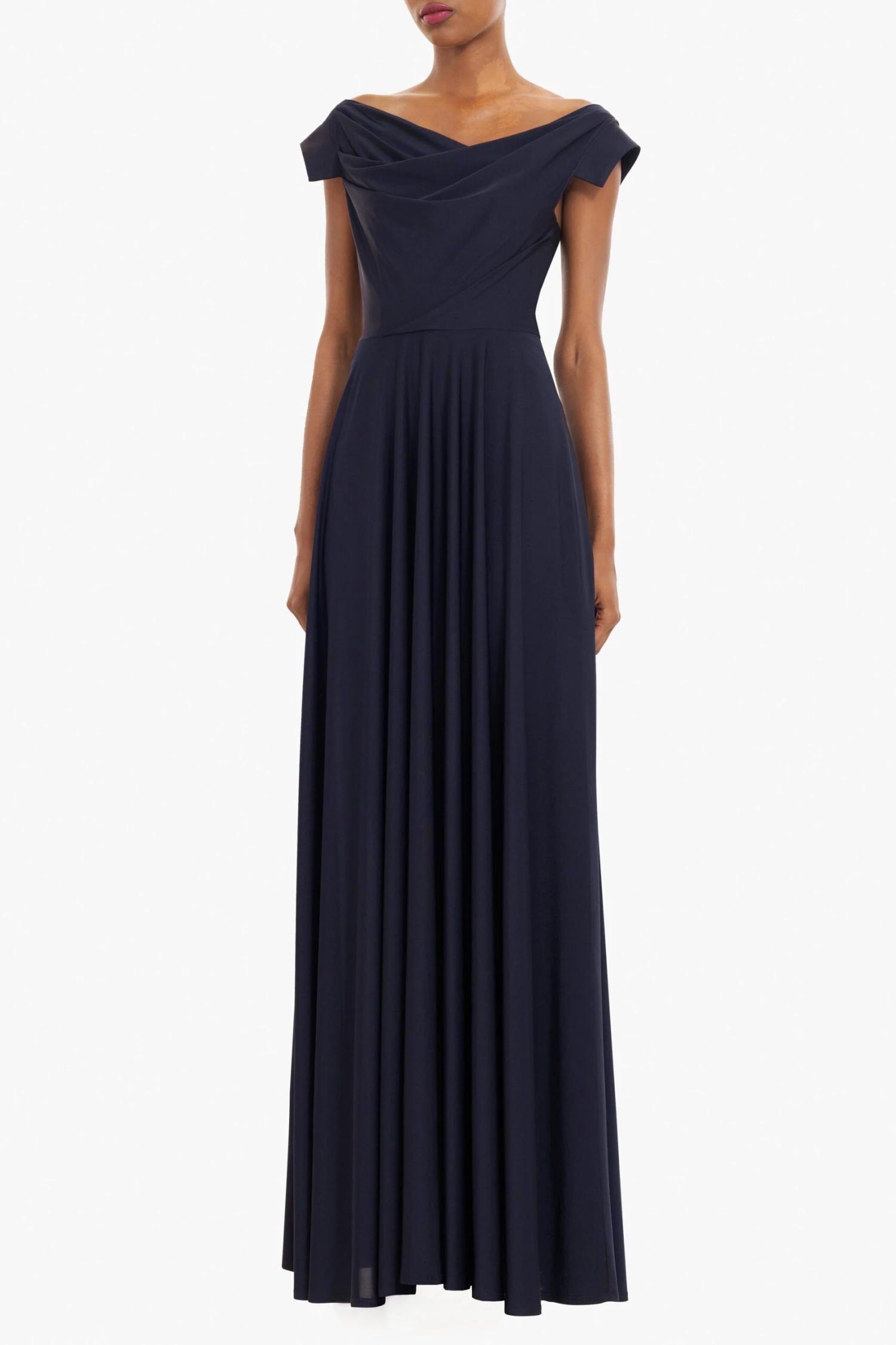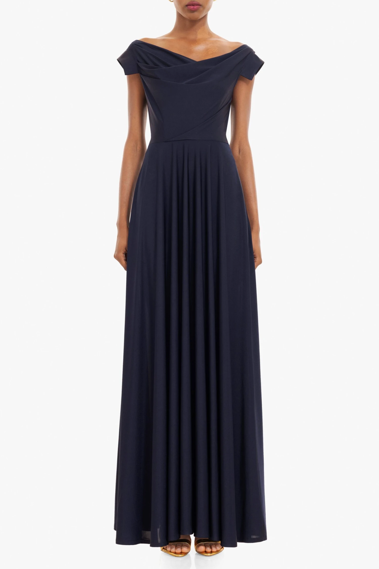 The Jacqueline Gown crafted from soft stretch jersey, this dress showcases a draped off-the-shoulder neckline that gracefully frames the collarbone. The tucked bodice detailing enhances the silhouette, leading into a flowing floor-length skirt. Designed for ease, it slips on without closures and is fully lined for added comfort.