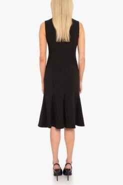 A timeless fit-and-flare dress designed with clean lines and subtle movement. The structured bodice features precise seaming that enhances the silhouette, while the skirt is finished with godet inserts, adding volume and a graceful flow with every step.