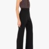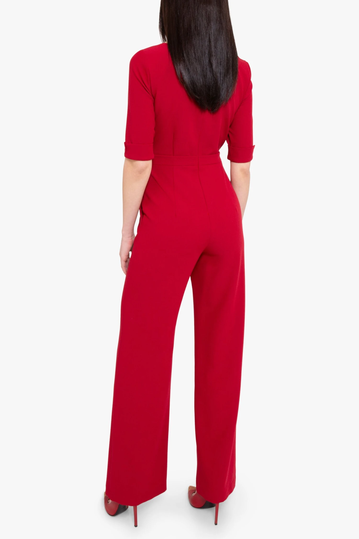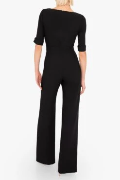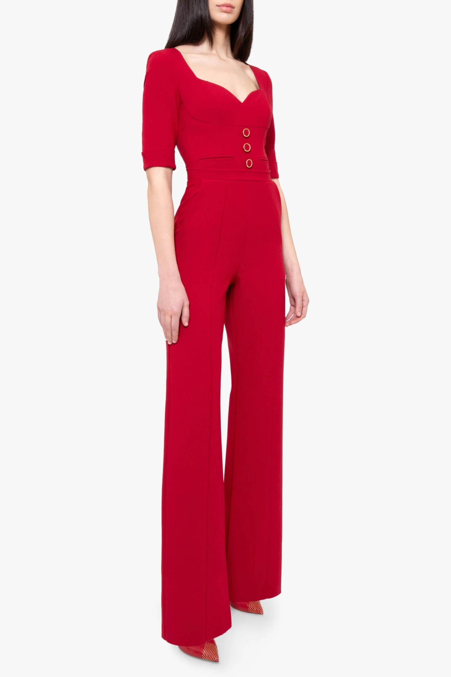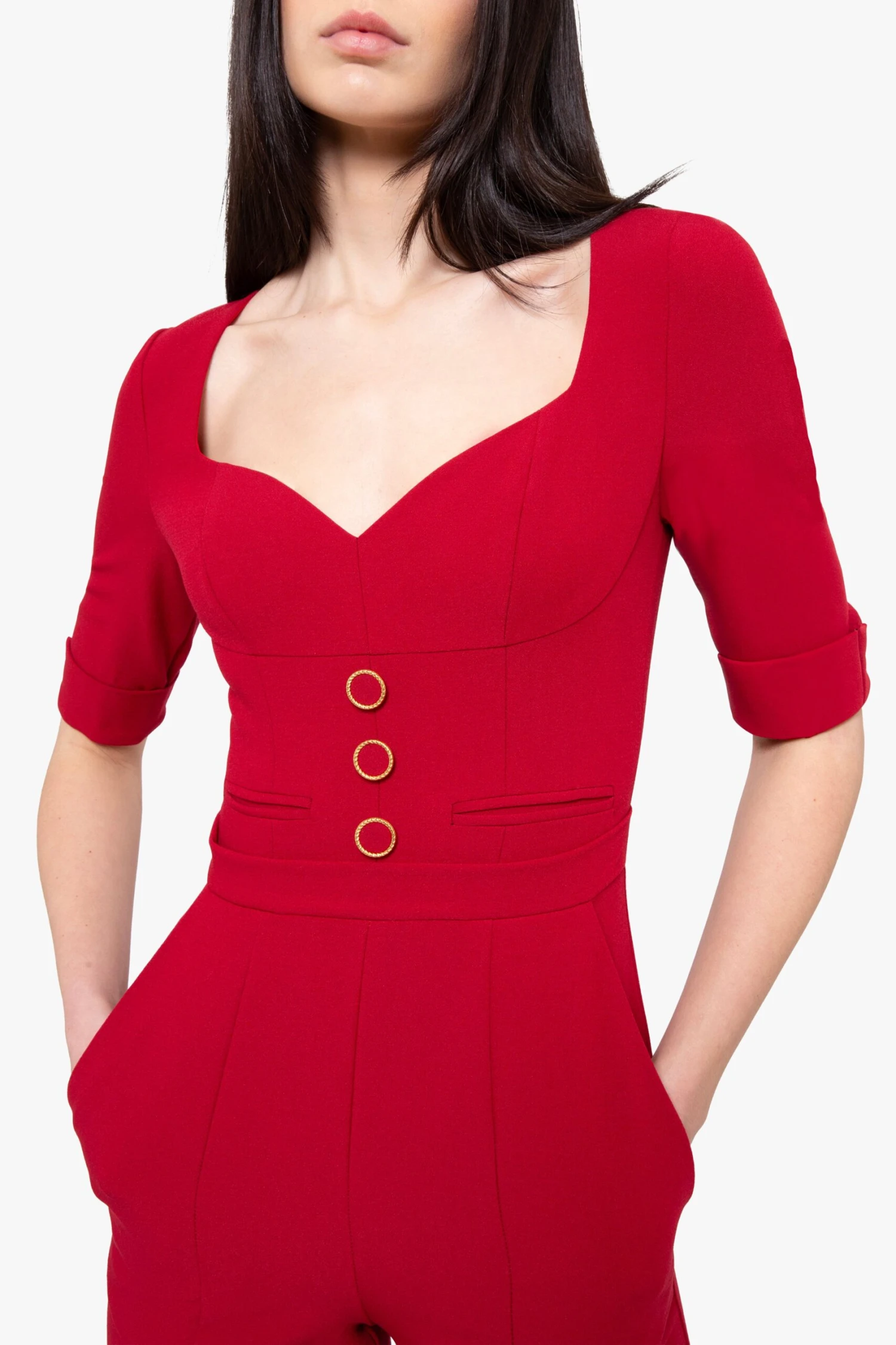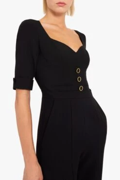 Sophistication meets modern elegance in a tailored jumpsuit featuring a flattering sweetheart neckline, gold-tone button accents, and structured 3/4 sleeves with rolled cuffs. Designed to make a bold statement, the piece is crafted from mid-weight suiting fabric, offering comfort and style for formal occasions or evenings out.