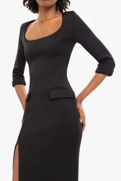 The Kismet Midi Dress is crafted from sculpting bonded knit, this midi dress contours the body with clean lines and structured detail. It features a scoop neckline and three-quarter sleeves with lightly padded shoulders for a tailored touch. The faux flap accents at the waist add subtle interest, while the thigh-high slit offers just the right amount of edge. A concealed back zipper ensures a smooth fit from every angle.