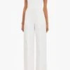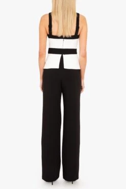 The Kyria CB faux two-piece jumpsuit blends modern design with a structured silhouette. The bodice features bold color blocking, highlighted by a square neckline and adjustable shoulder straps. A peplum waistline cinched with a self-belt and a sleek rectangular buckle enhances the shape, offering a flattering fit. Front faux welt pockets add a chic touch, while the bootcut pants elongate the legs for a polished finish.