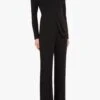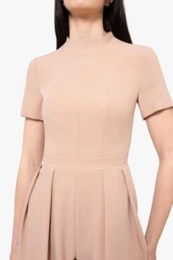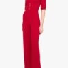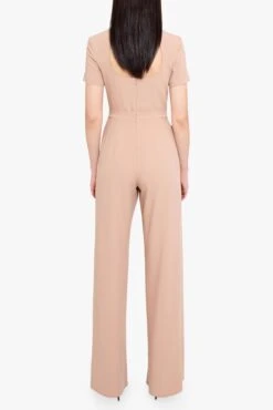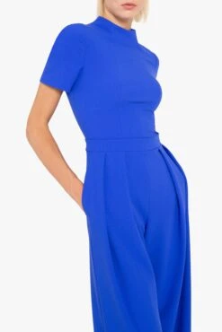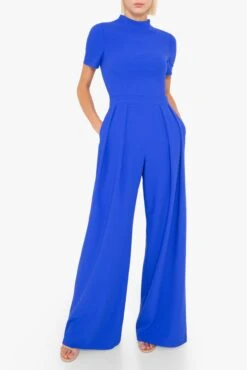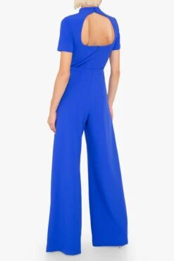 Mayra jumpsuit is designed to make a bold statement, blending elegance and comfort effortlessly. Featuring short sleeves and a mock neckline, it creates a sleek, modern silhouette. The top of this garment showcases a structured design with three visible seam lines run vertically from the neckline to the waist, enhancing the tailored fit and giving the garment a sleek, contoured look. The wide-leg pants and back keyhole cutout add a dramatic flair, making it perfect for any event.
