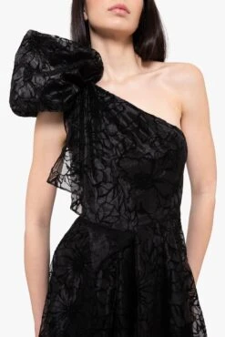 An elegant gown crafted from floral flocked organza, featuring a dramatic one-shoulder neckline with a statement draped bow. The floor-length silhouette creates a refined and sophisticated look, while the delicate floral detailing adds texture and charm. Perfect for galas, weddings, or black-tie events, this design combines timeless beauty with modern flair.