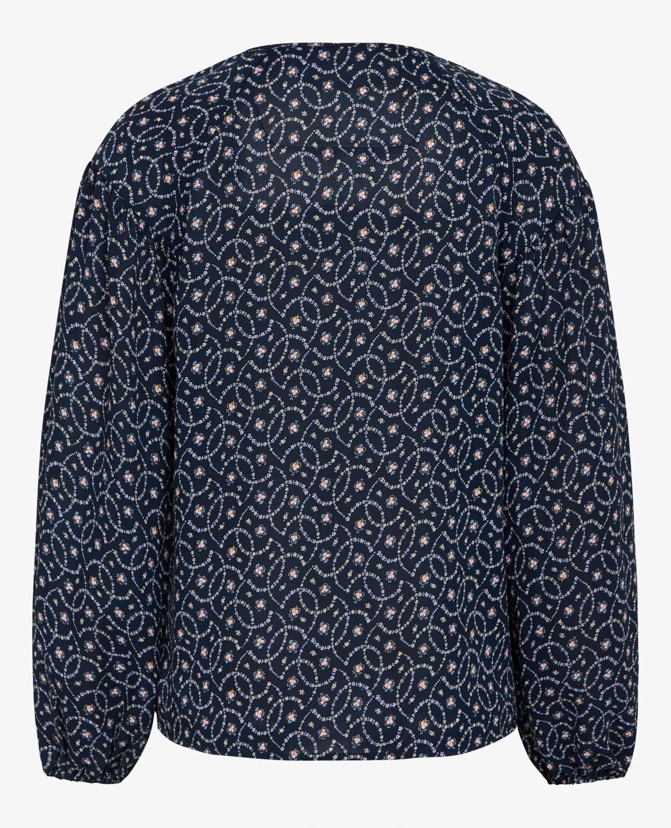 With its light and flattering silhuet, this blouse in 100% recycled polyester is an absolute favorite. The blouse is designed with v-neckline and string that can be tied in front. The style has a true Noa Noa print with small and scatterede dots capturing the essence of timeless elegance and sophistication.