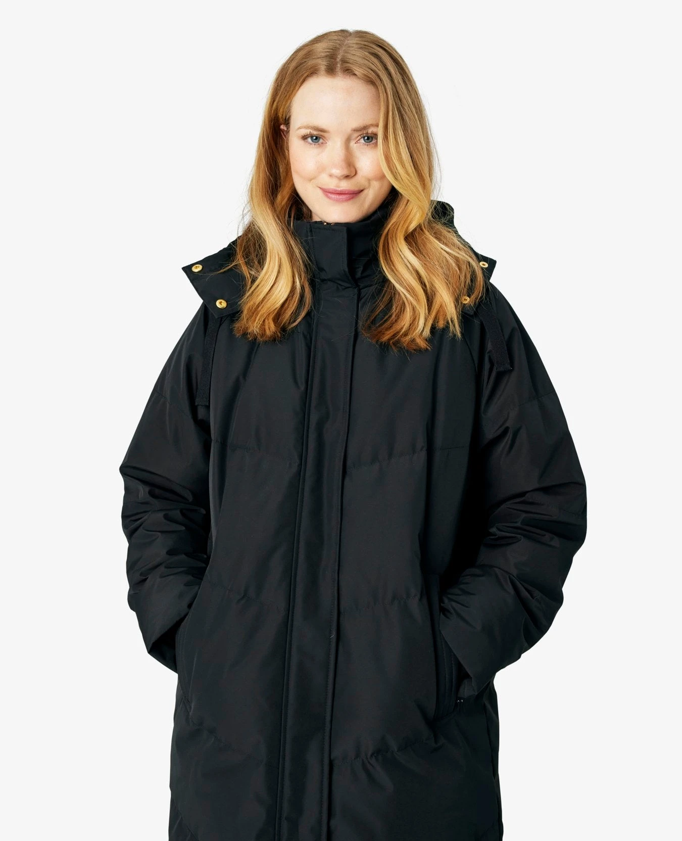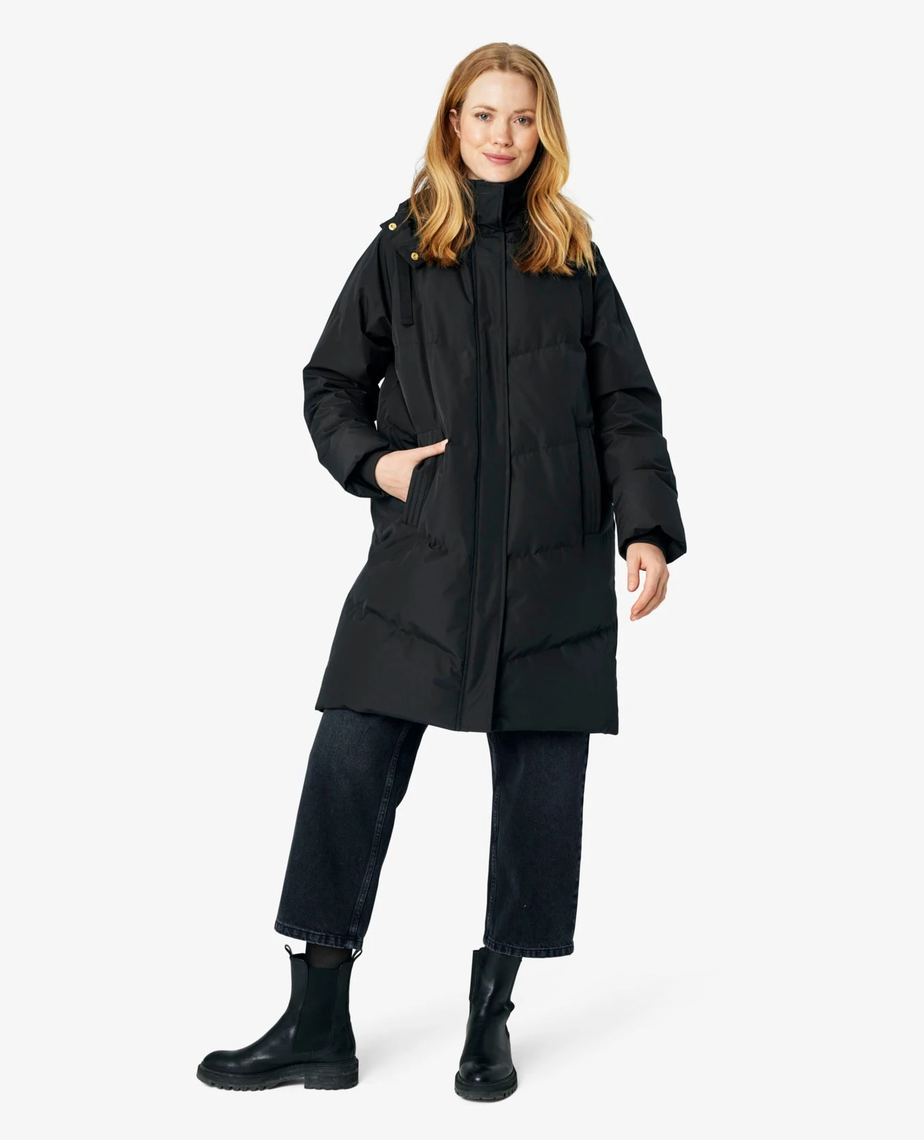 • Comfortable down coat with detachable and adjustable hood. Pockets in front.