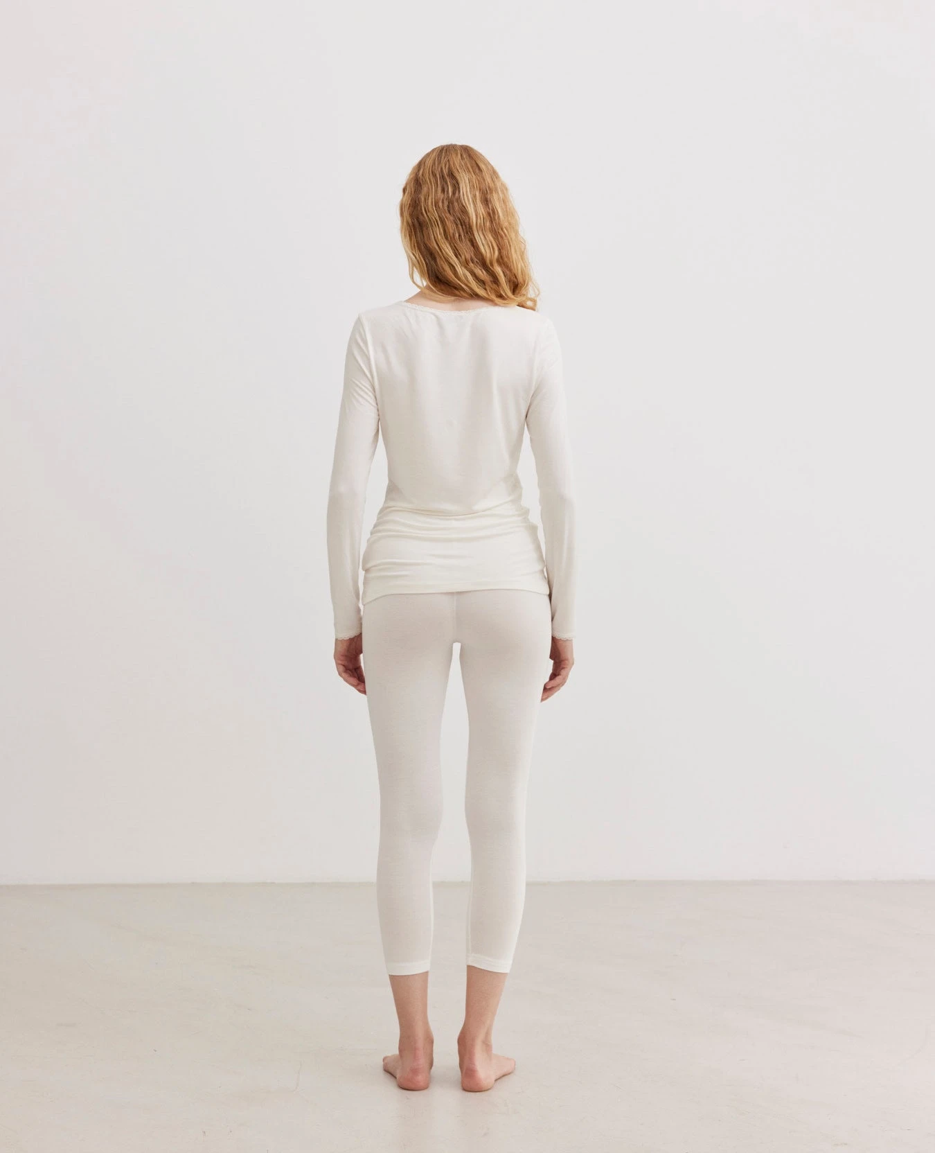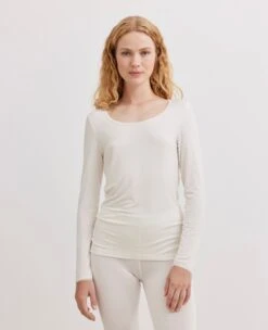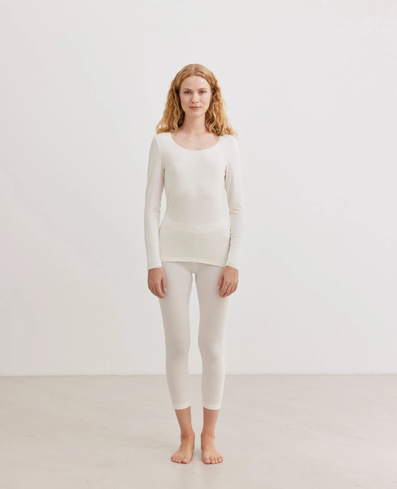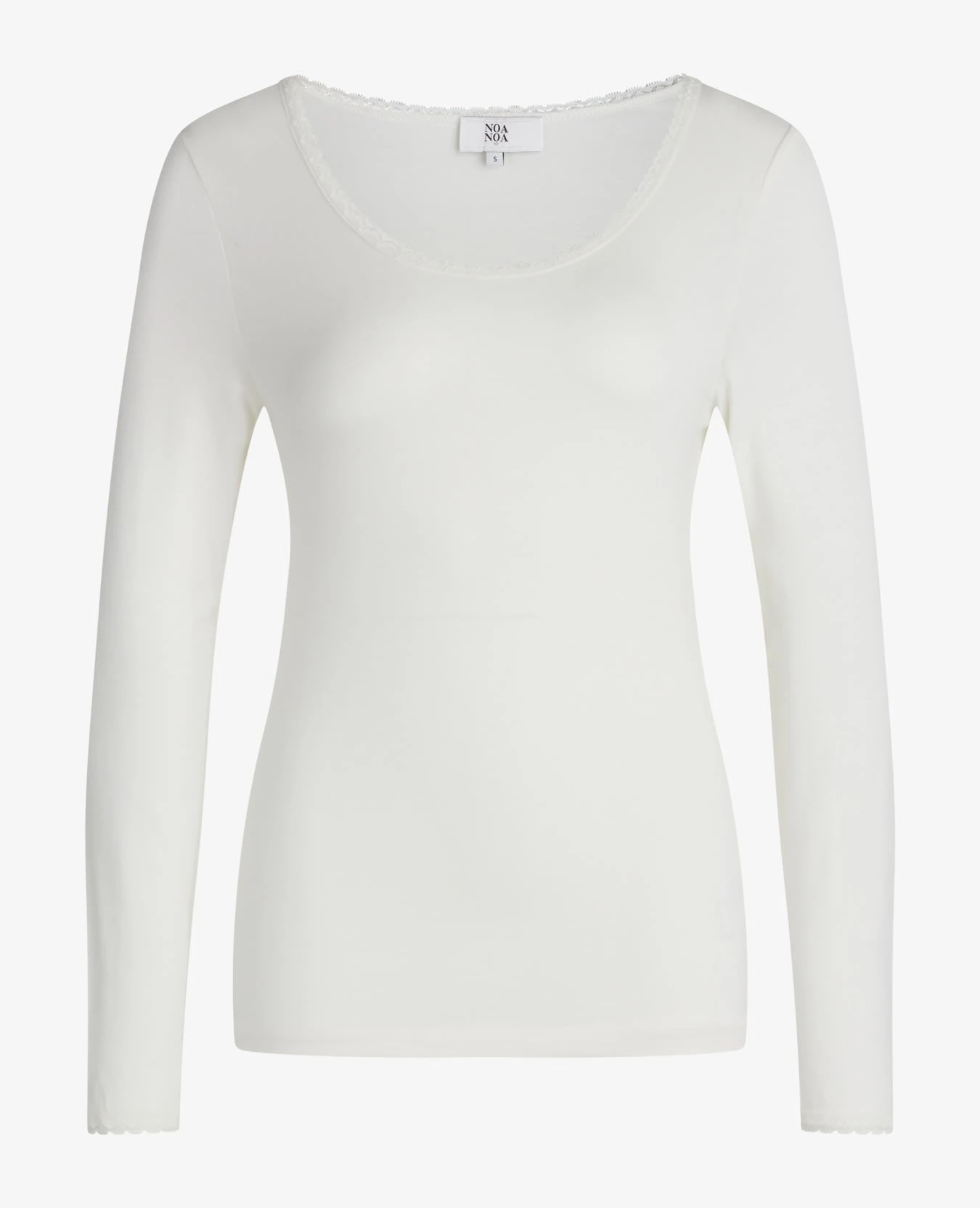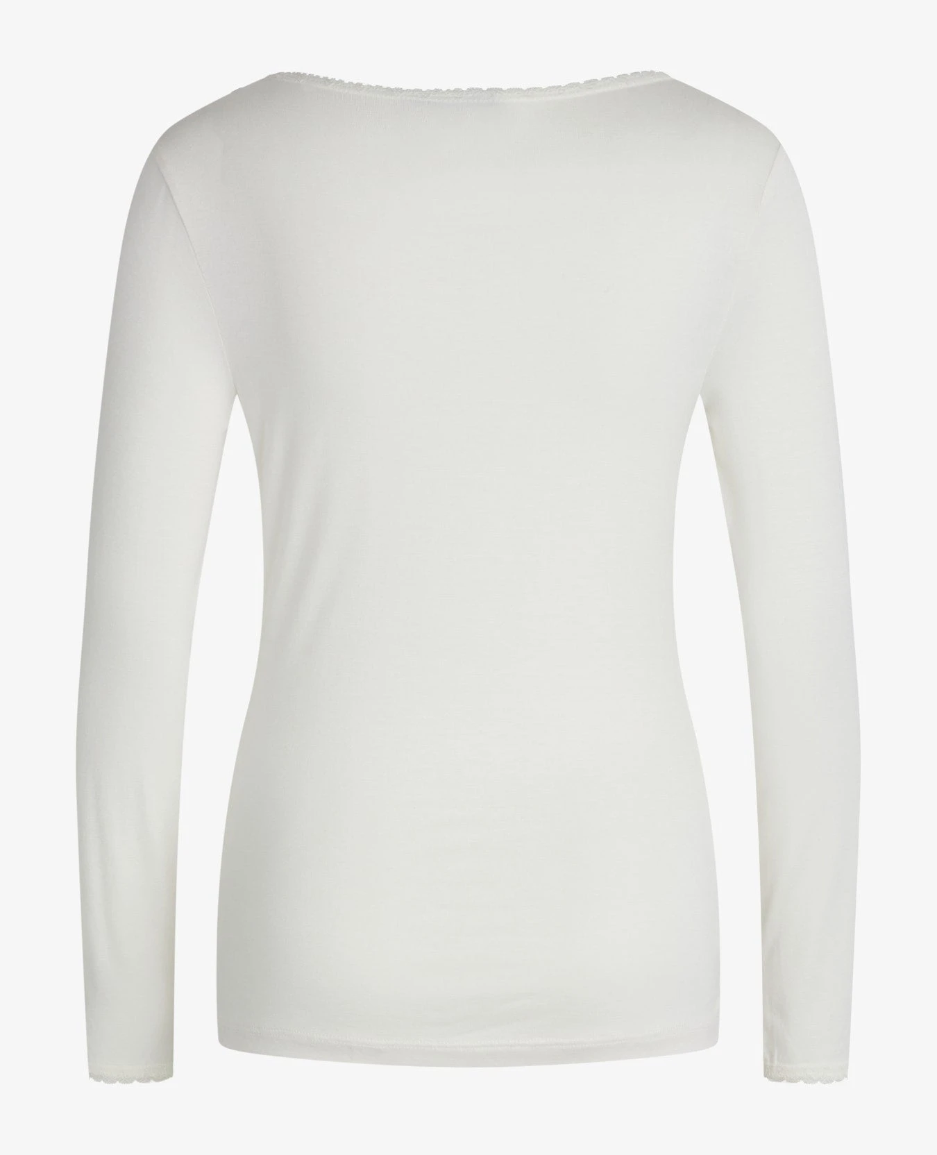 Long-sleeved T-shirt with narrow lace band around the neckline and wrists. The T-shirt has a round neckline and a slim fit.