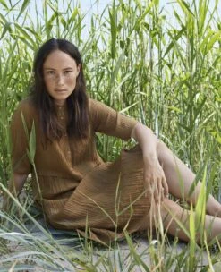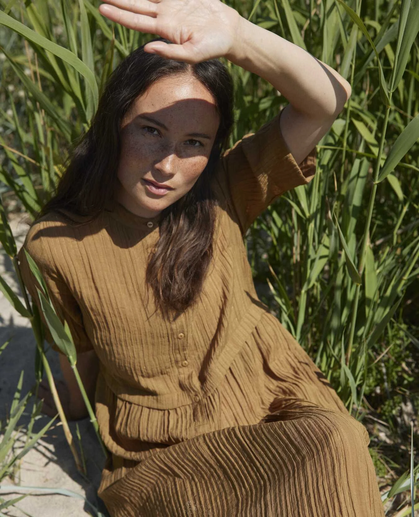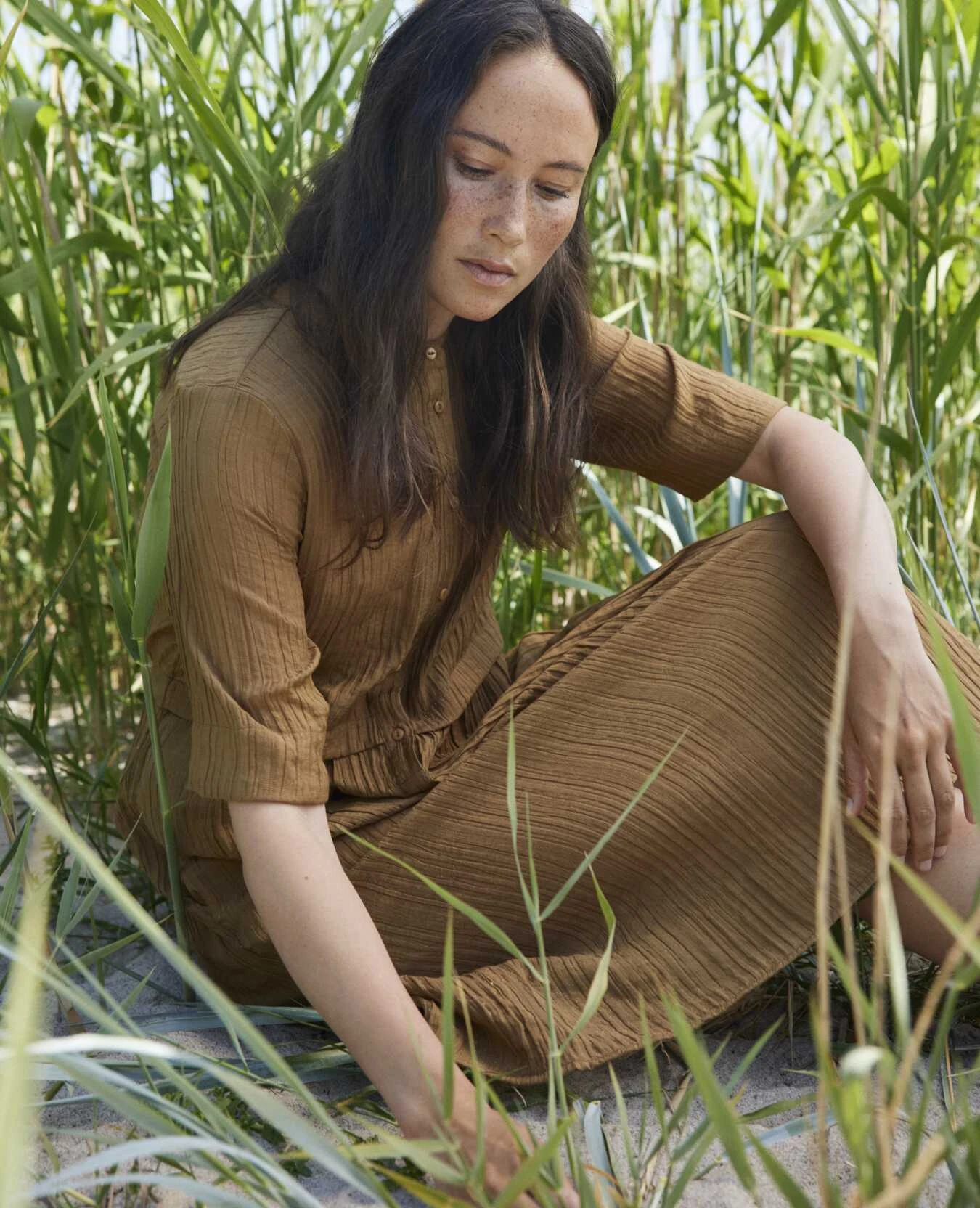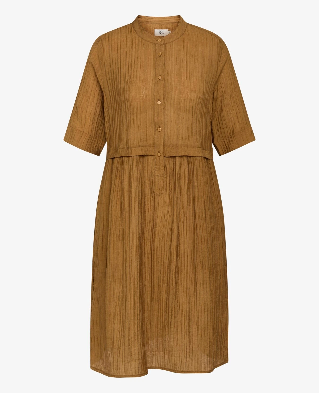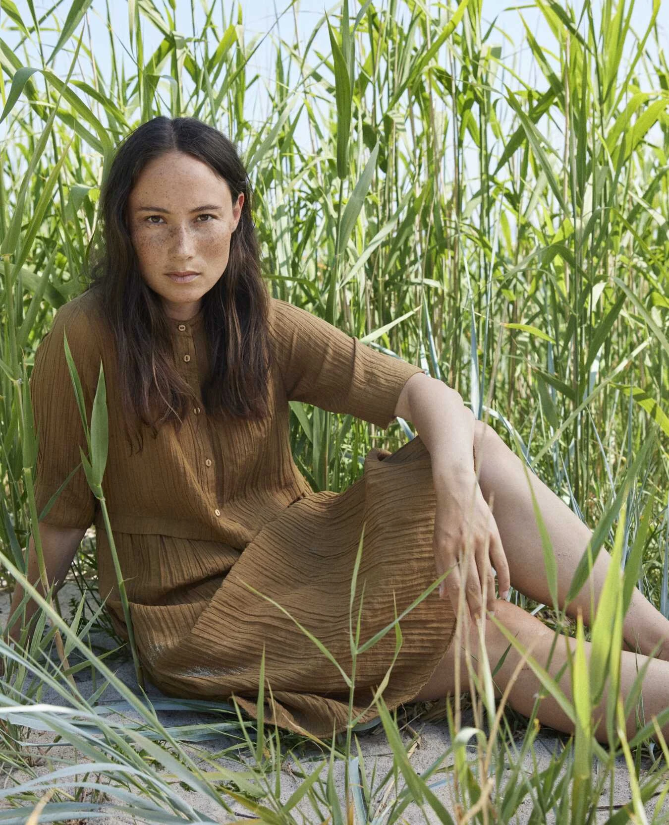 Simple in shape, this shirt dress comes in 70% LENZING™ ECOVERO™ viscose. The dress is designed with half placket down the front with button closure, mandarin collar, short sleeves and cutline at waist.