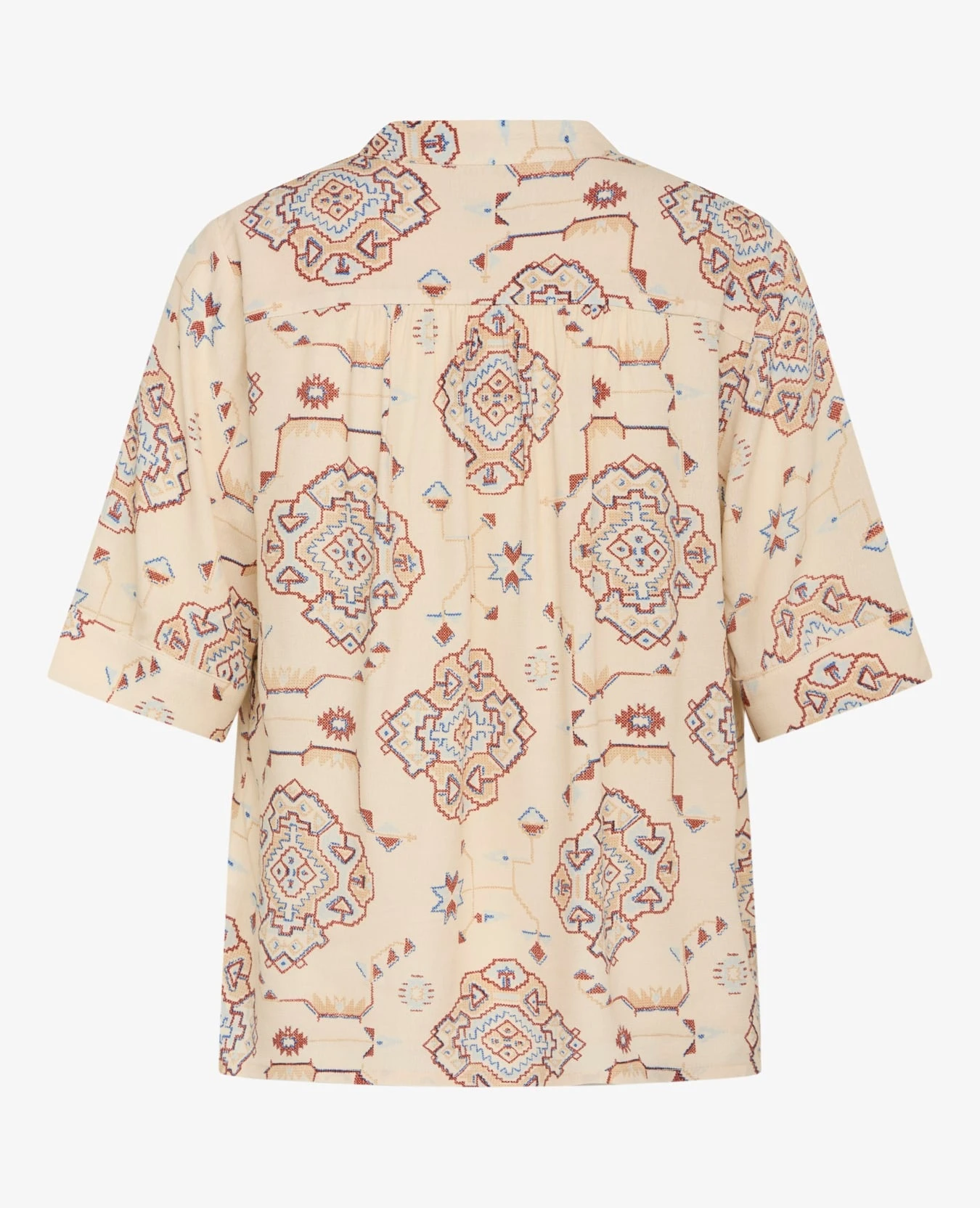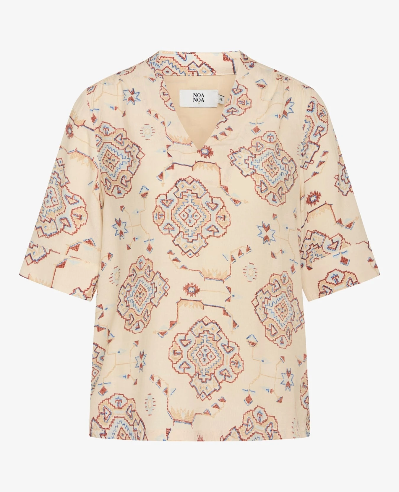 This v-neck blouse with handdrawn Noa Noa print is designed with mandarin collar and short sleeves and already a true summer favorite.