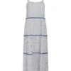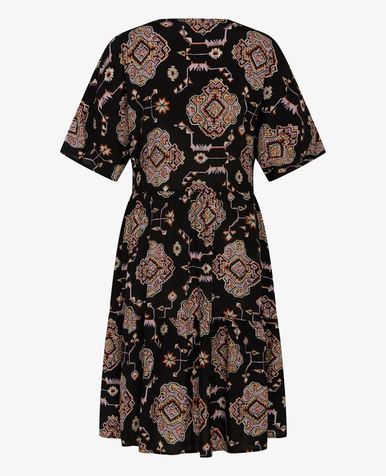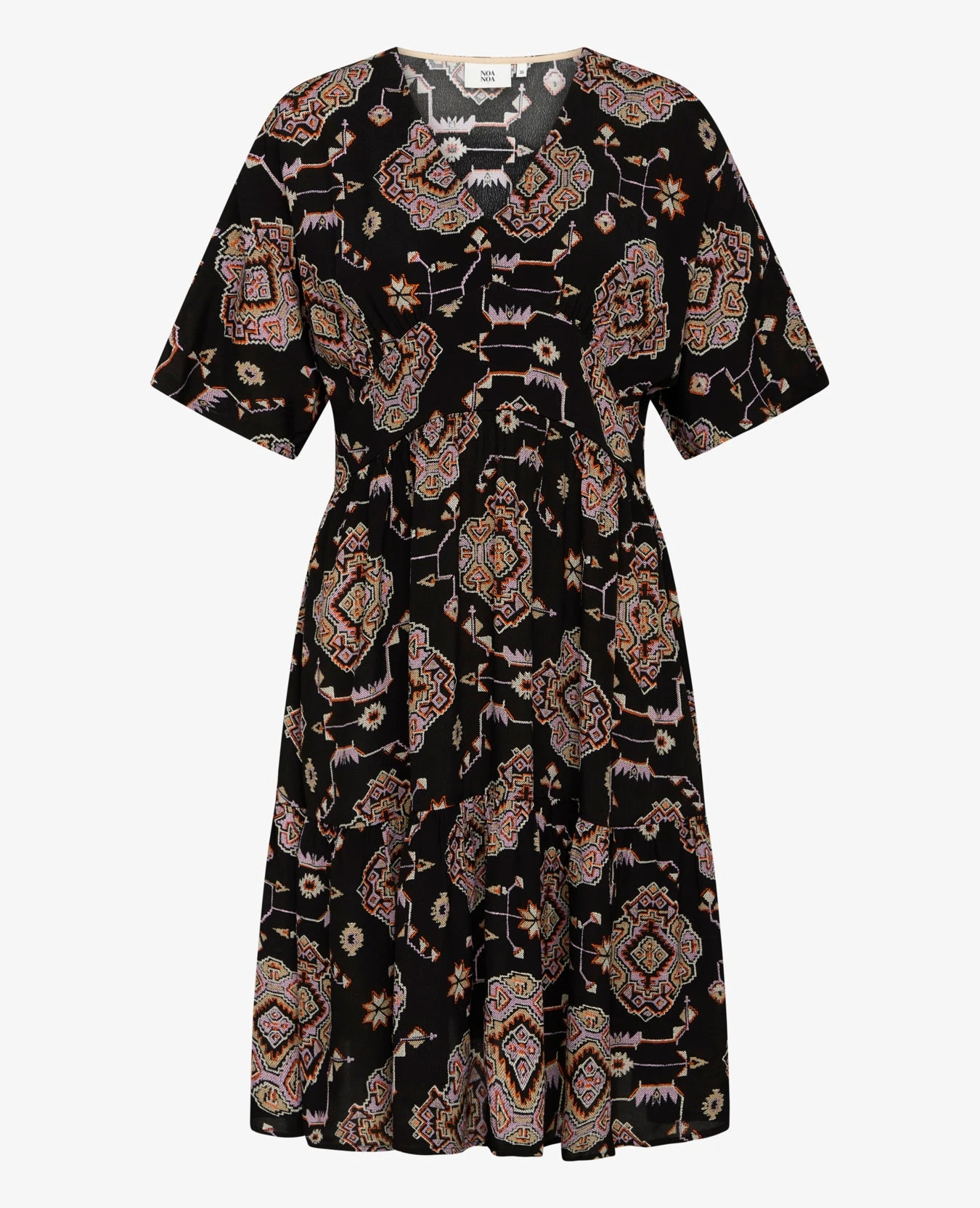 This simple and easy viscose dress is designed with v-neckline nad gatherings above and below the waistband. Let the handdrawn print stand out simply by adding sandals.