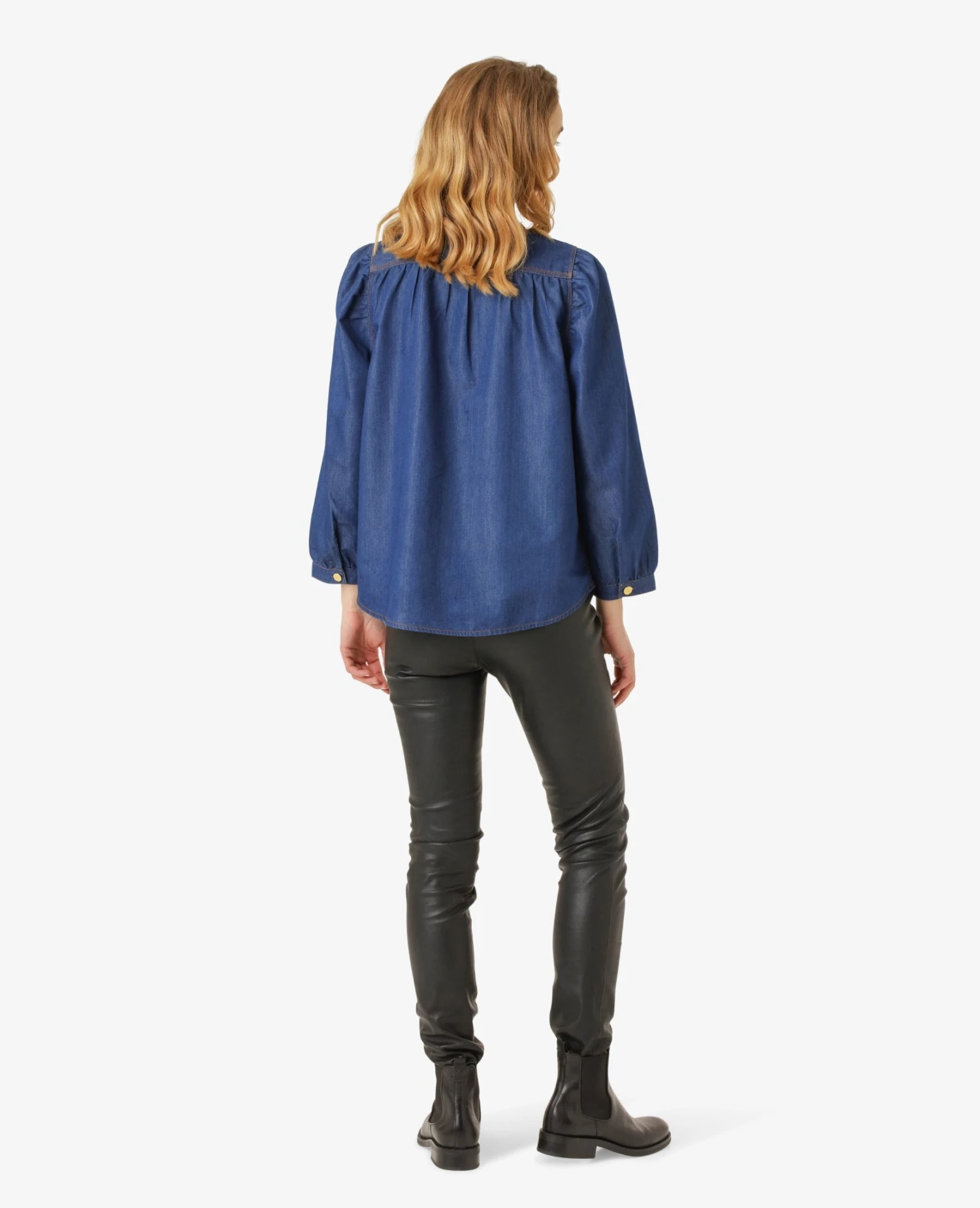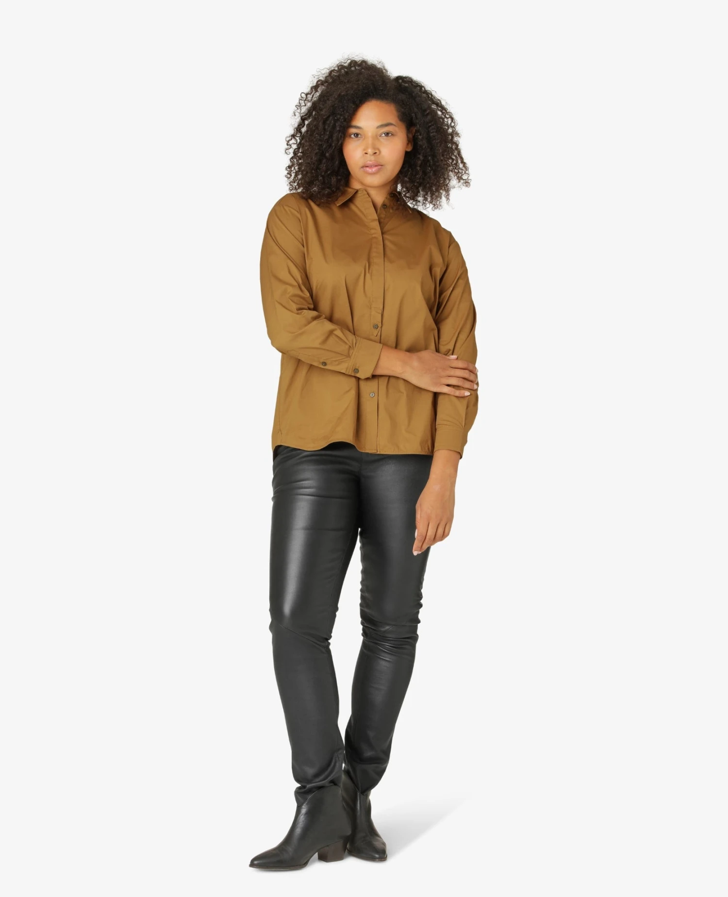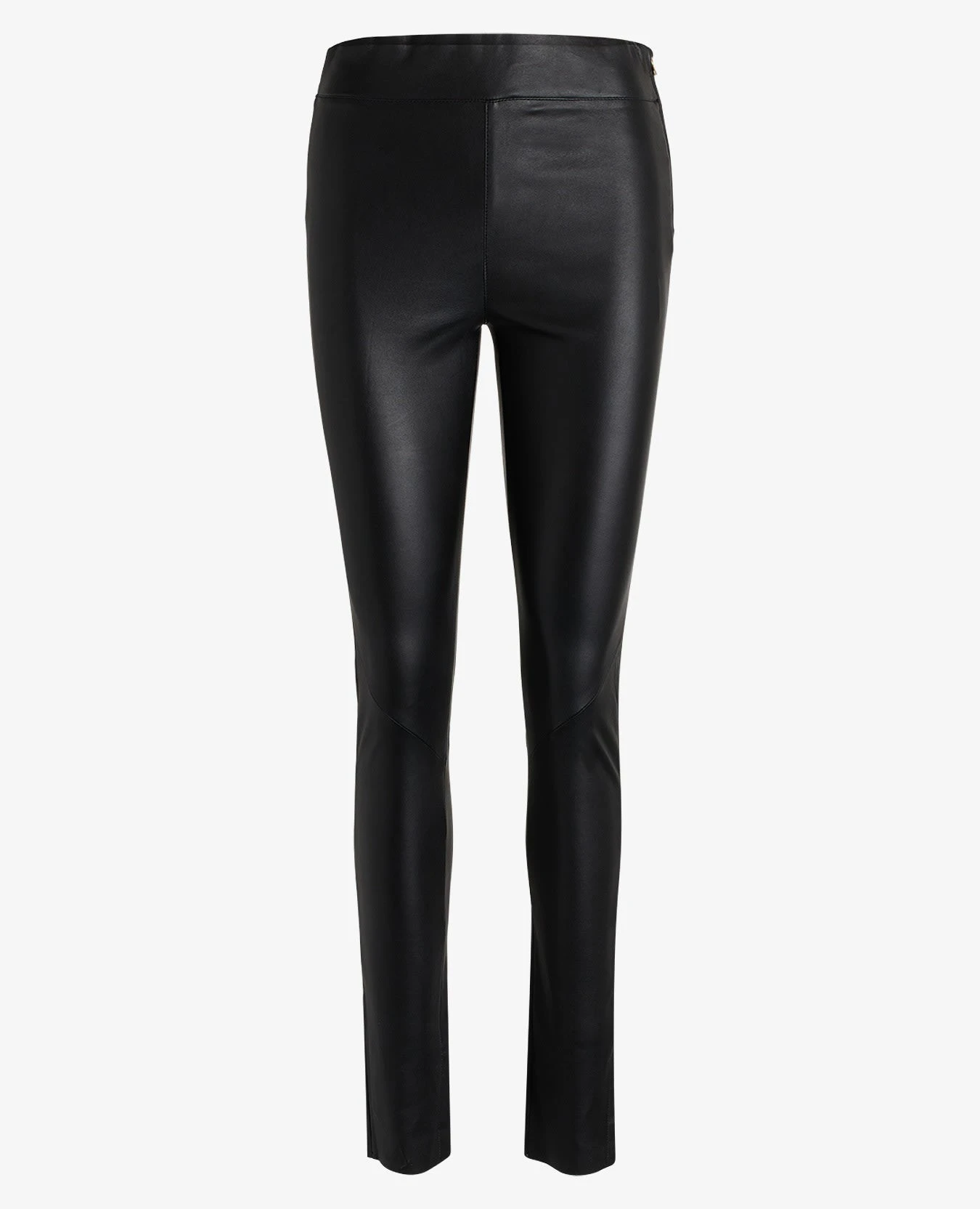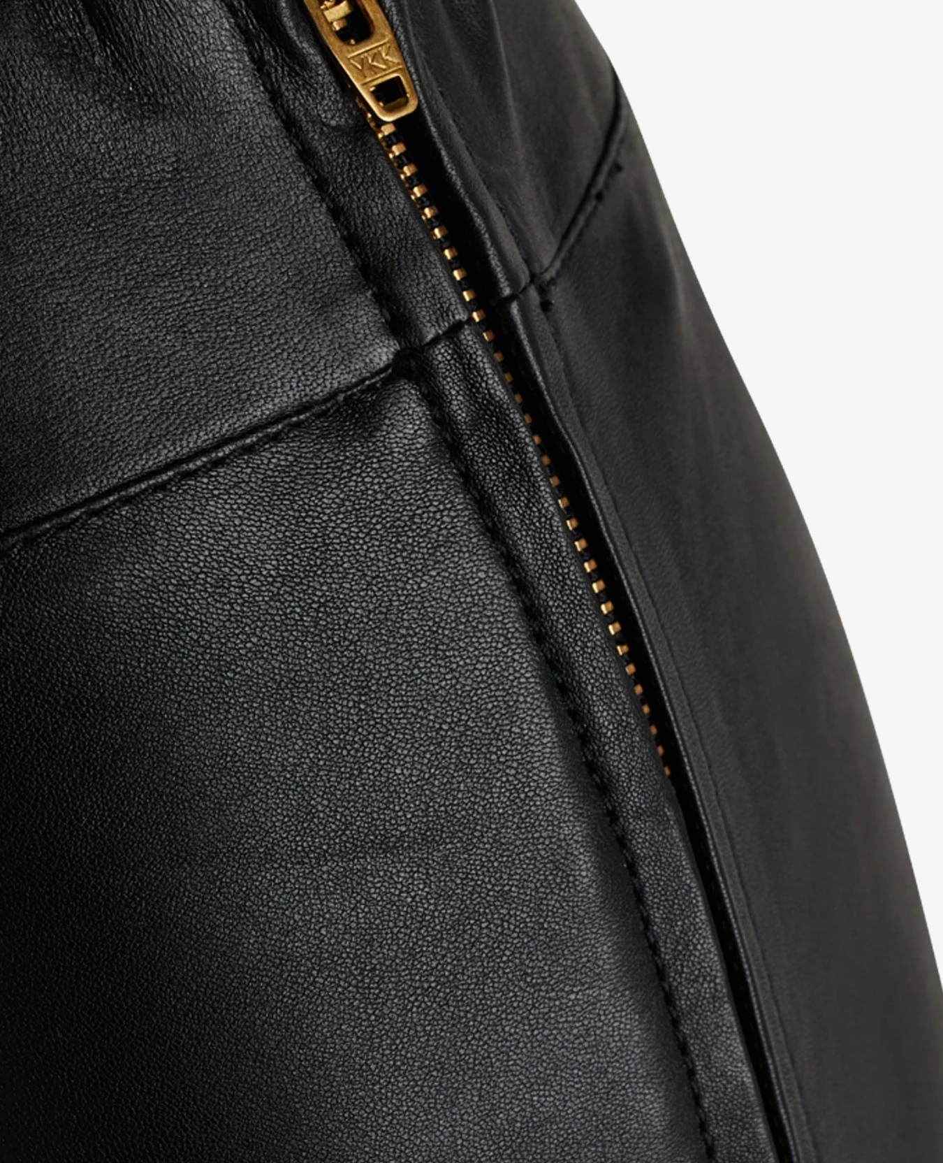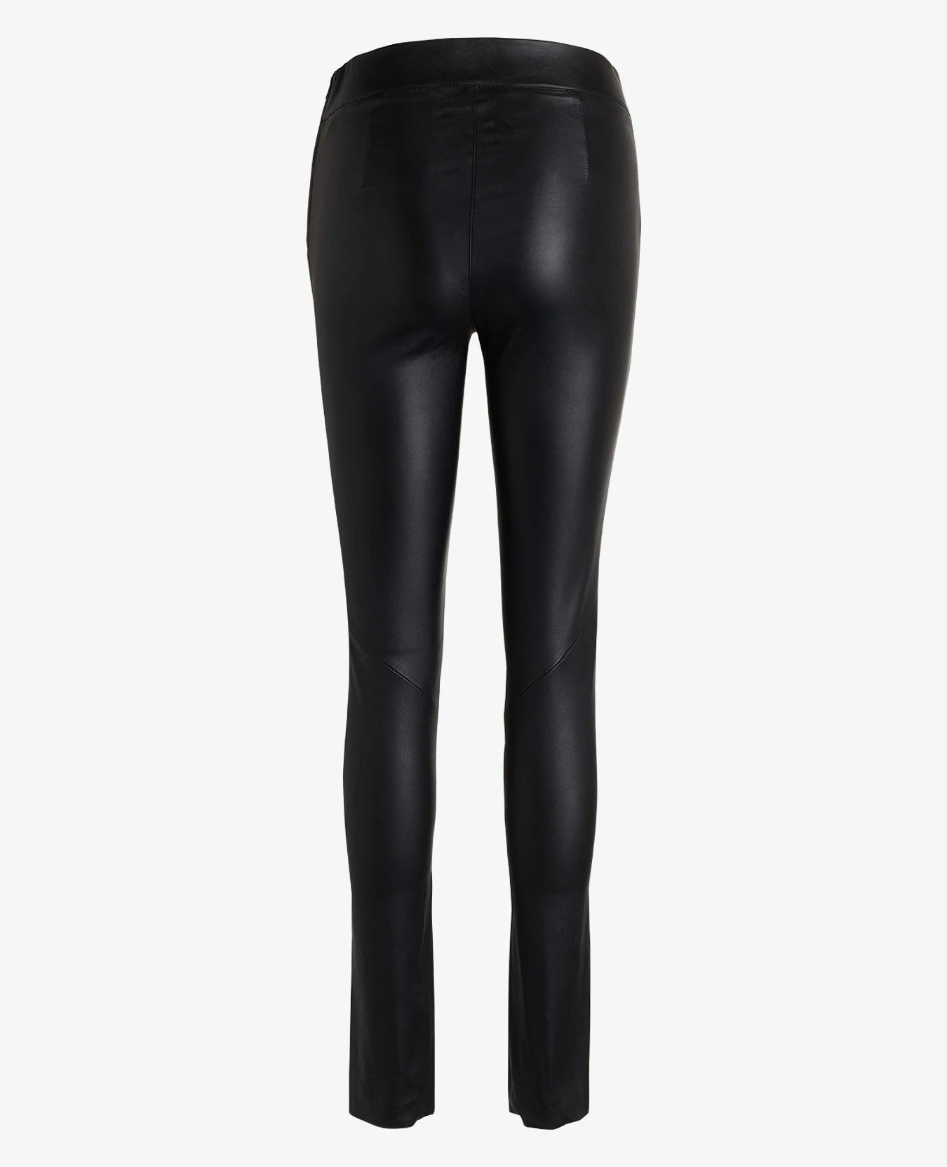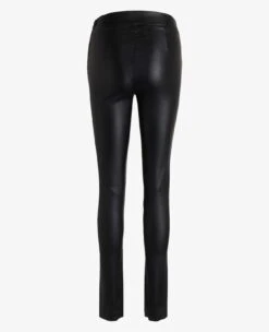 Slim, stretchy leather trousers with zipper fastening on the left side. The trousers have a wide waistband and decorative seams at the middle. The leather is very soft, which makes the leggings comfortable to wear for any occasion. If the length doesn’t fit, you can easily cut the leggings.