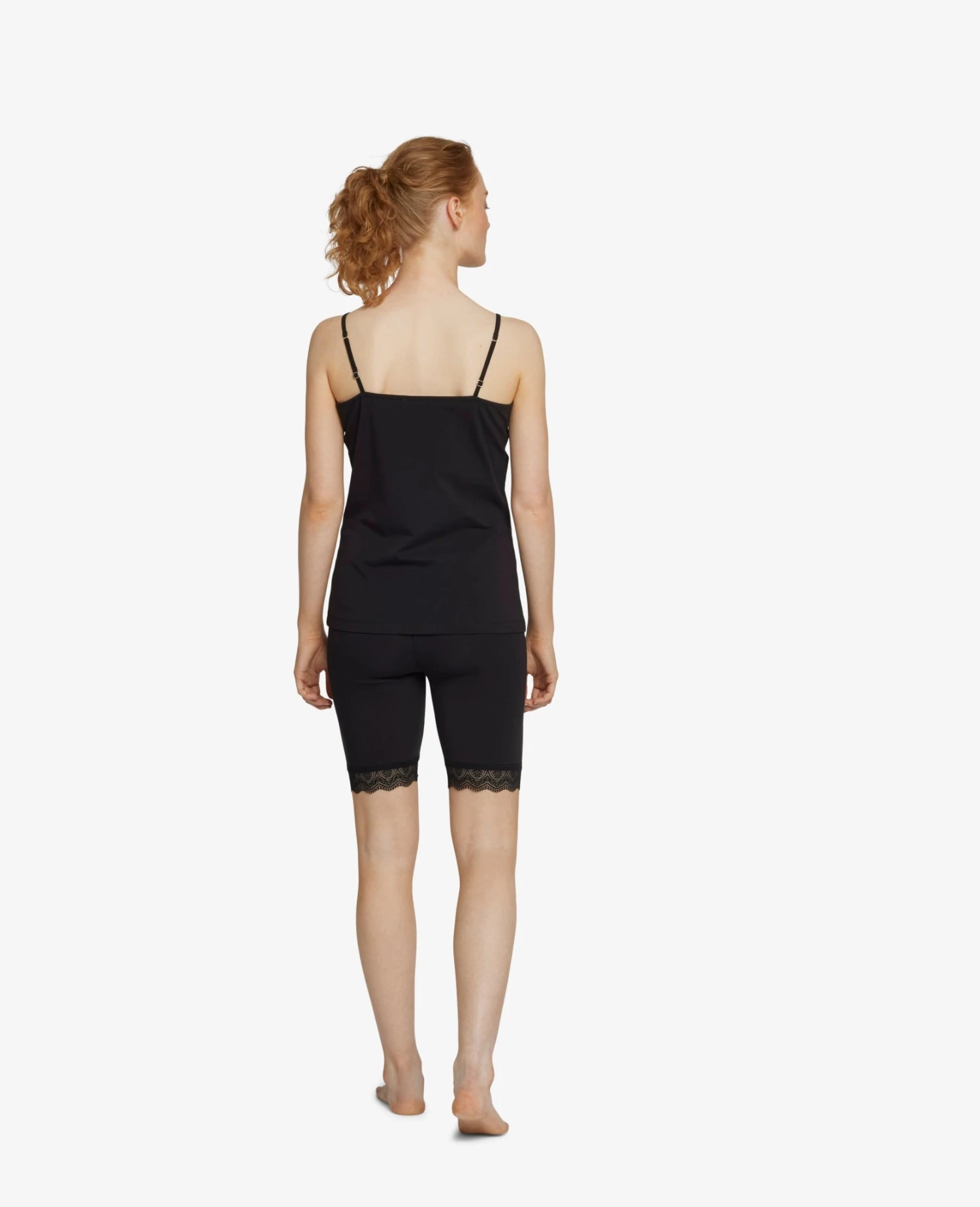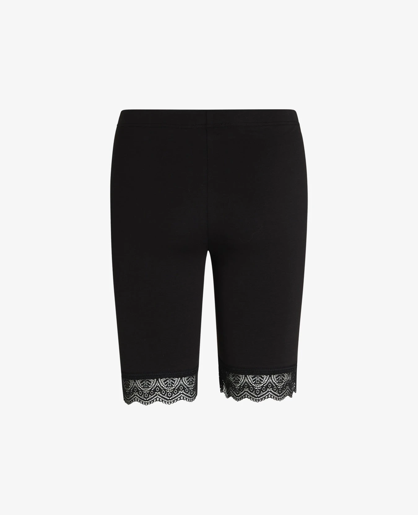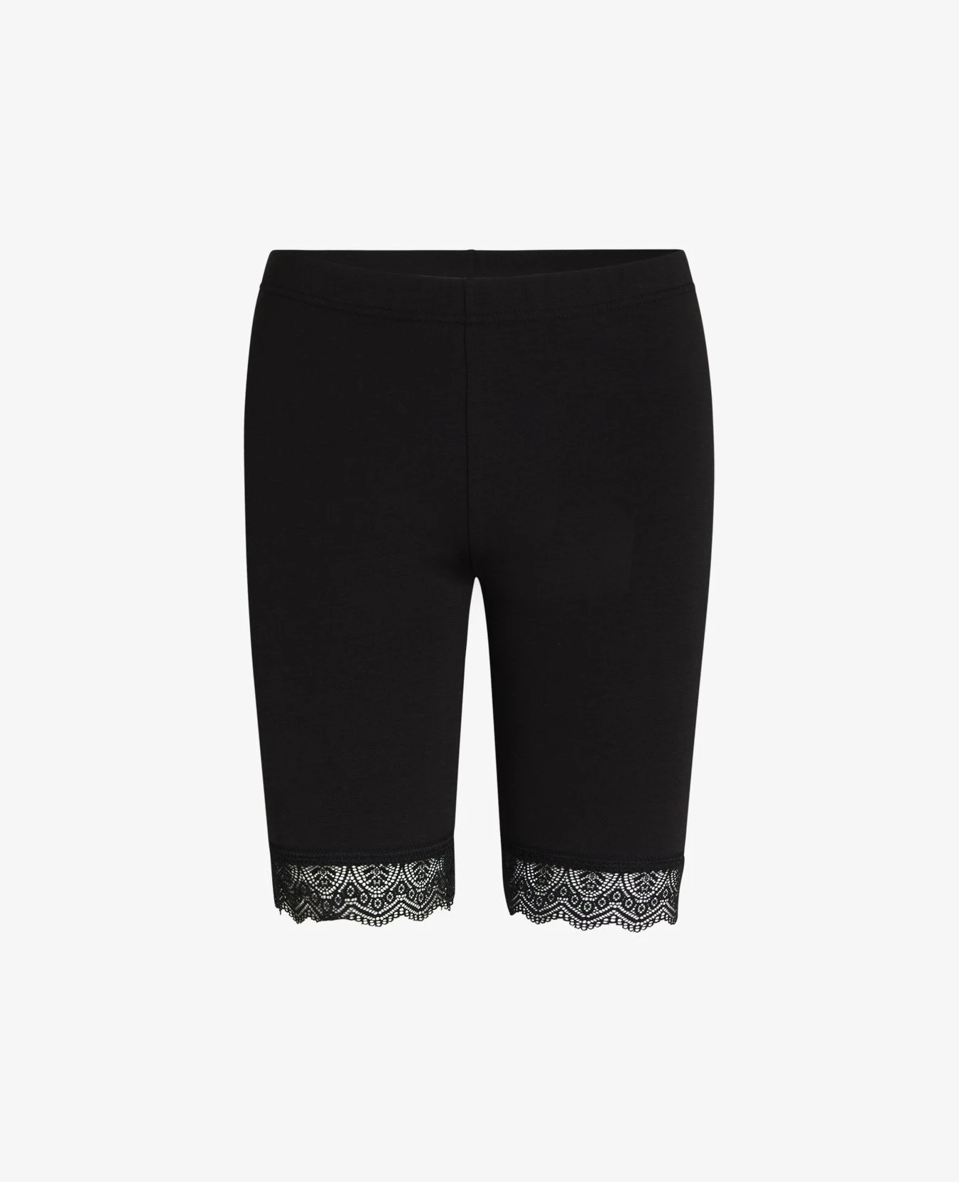 Cycling shorts in soft organic cotton with a wide lace band at the bottom. The waistband is elastic. The model is 174 cm and wears a size S. Outer leg length in size M: 45 cm.