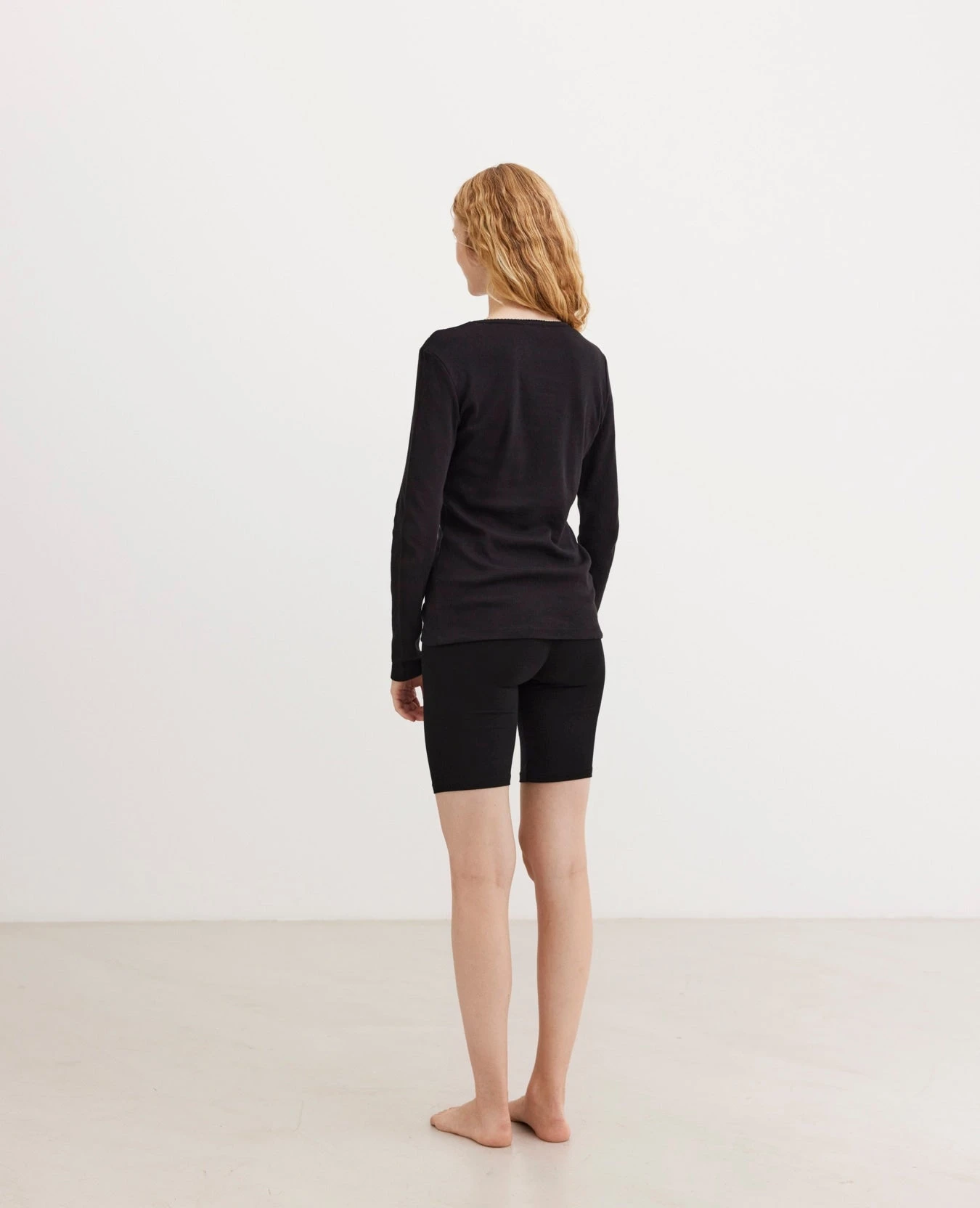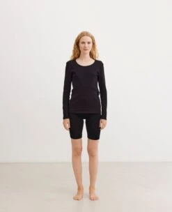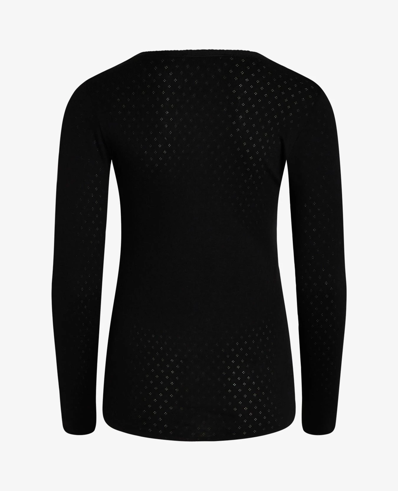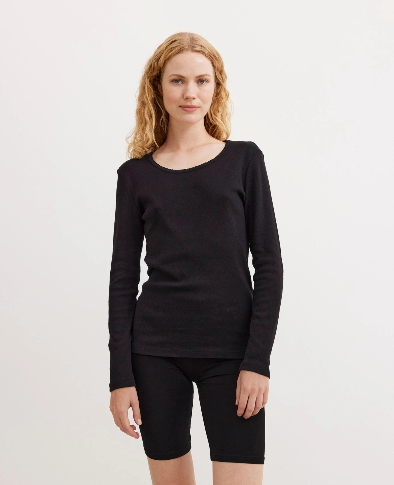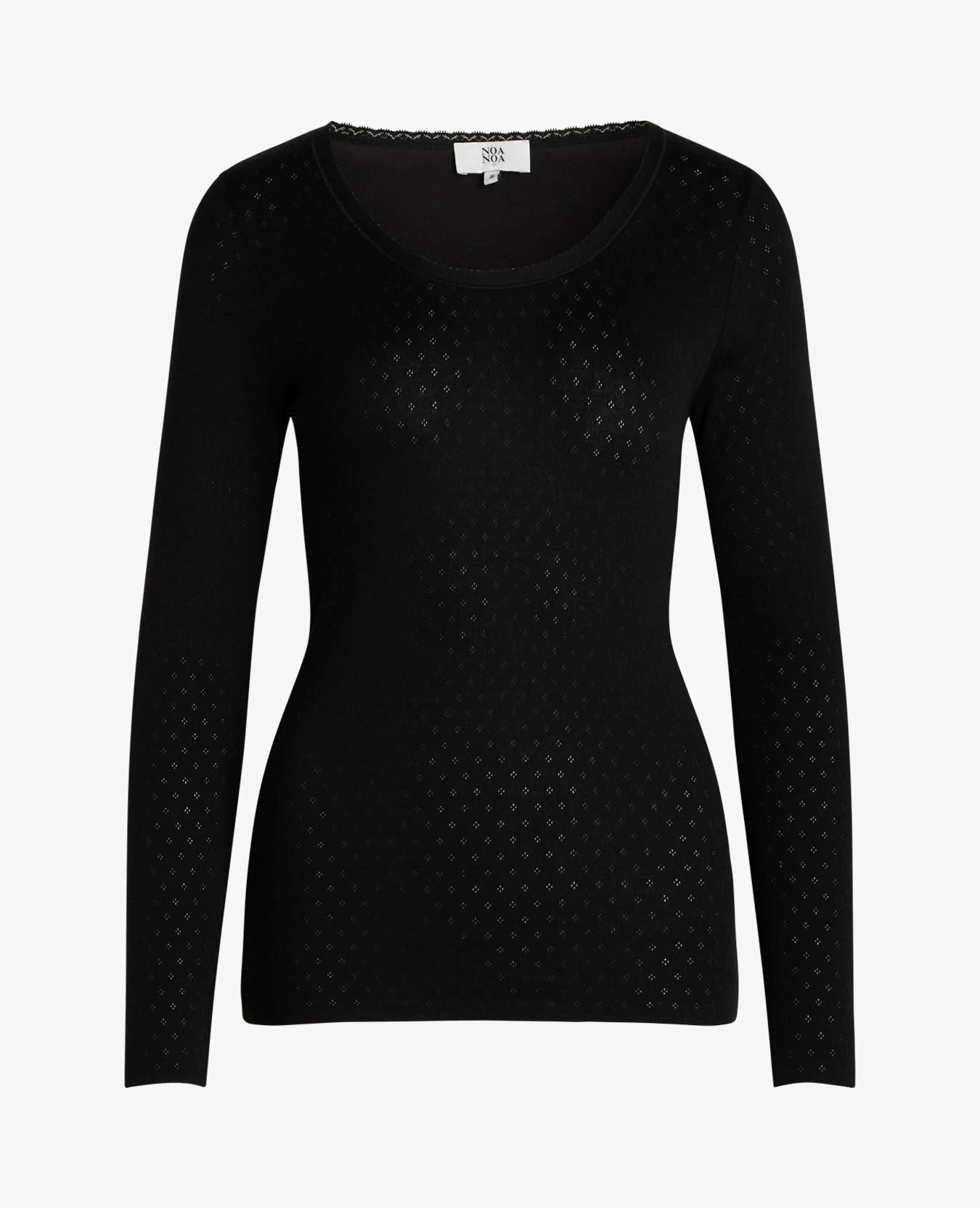 Long-sleeved T-shirt in soft organic cotton with Noa Noa’s signature pointelle pattern. The T-shirt has a round neckline and a slim fit. Model 1 is 177 cm and wears a size L/42. Model 2 is 174 cm and wears a size S.