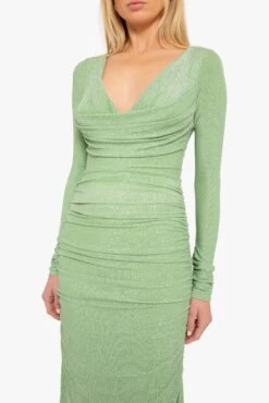 The Rafaela Maxi Dress features a draped V-neckline that adds a touch of fluidity to the bodice. Made in a textured stretch lurex knit, thoughtfully placed tucks sculpt the waist, while shirring along the skirt enhances the silhouette, creating a flattering and elongating effect. Designed with long fitted sleeves and a streamlined floor-length hem, this gown offers a sleek yet refined appeal.