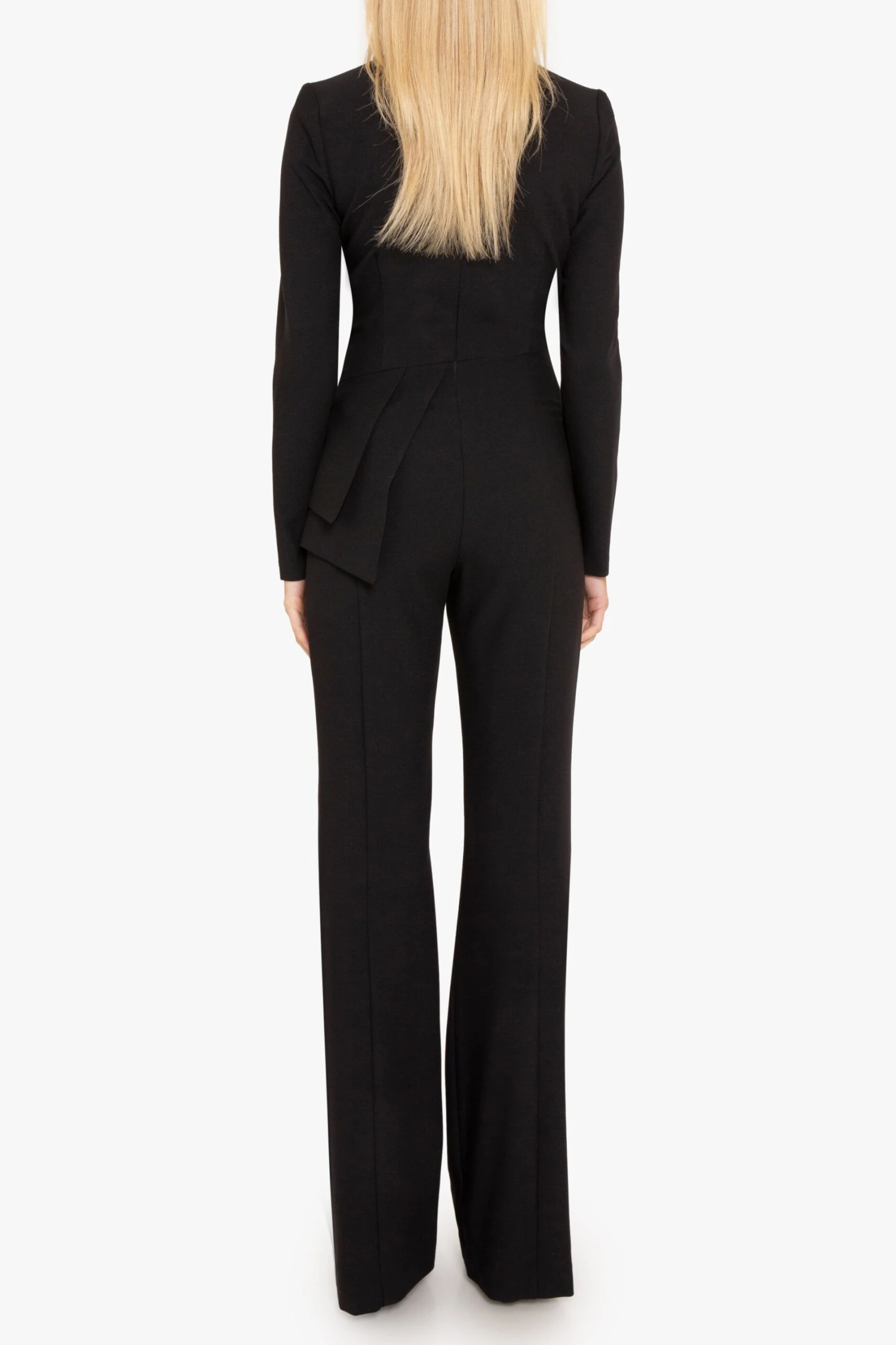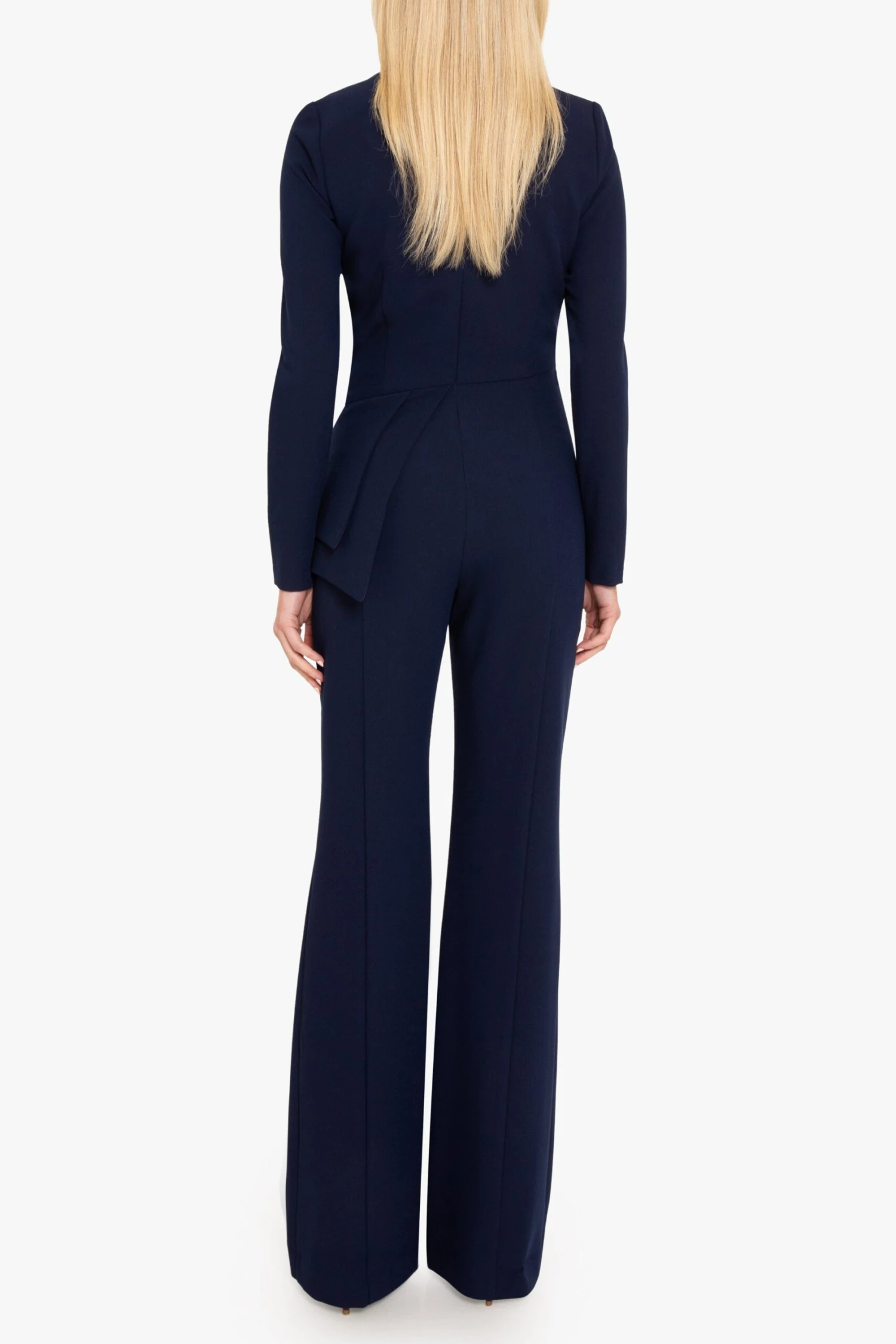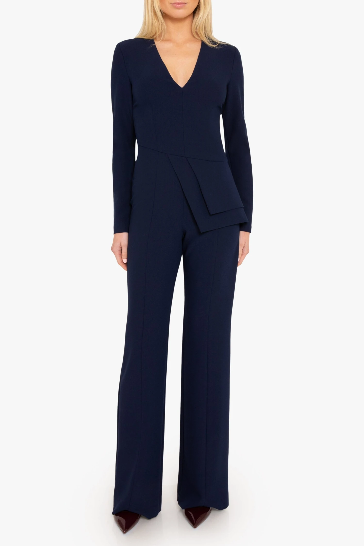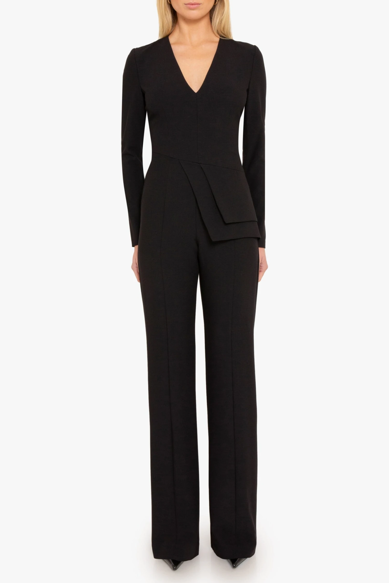 A sophisticated jumpsuit with a tailored fit and modern details. Featuring a flattering V-neckline, long sleeves, and a layered waist design, the style enhances your silhouette effortlessly. The wide-leg pants and stretch fabric ensure comfort and elegance for any occasion.