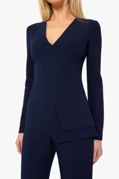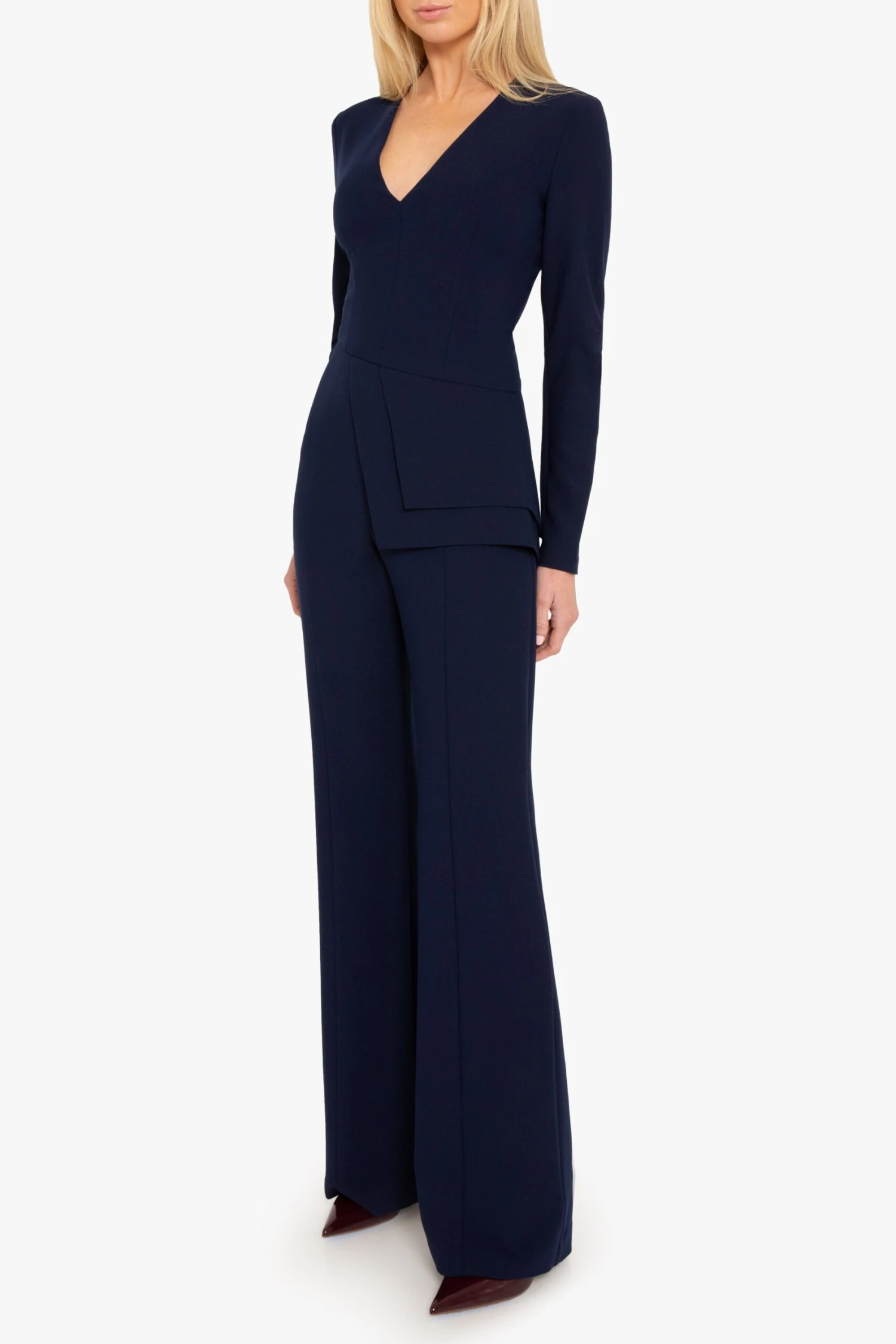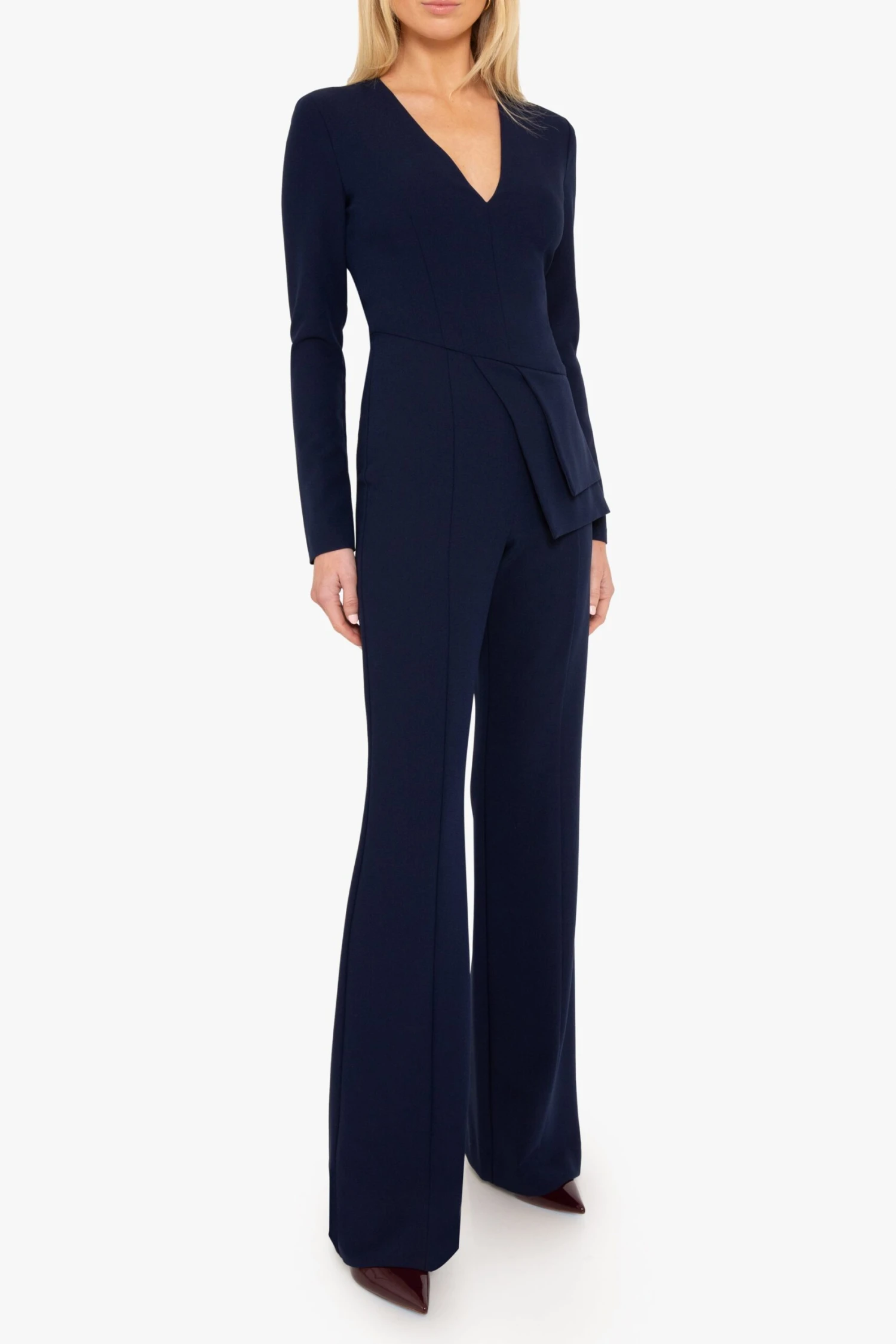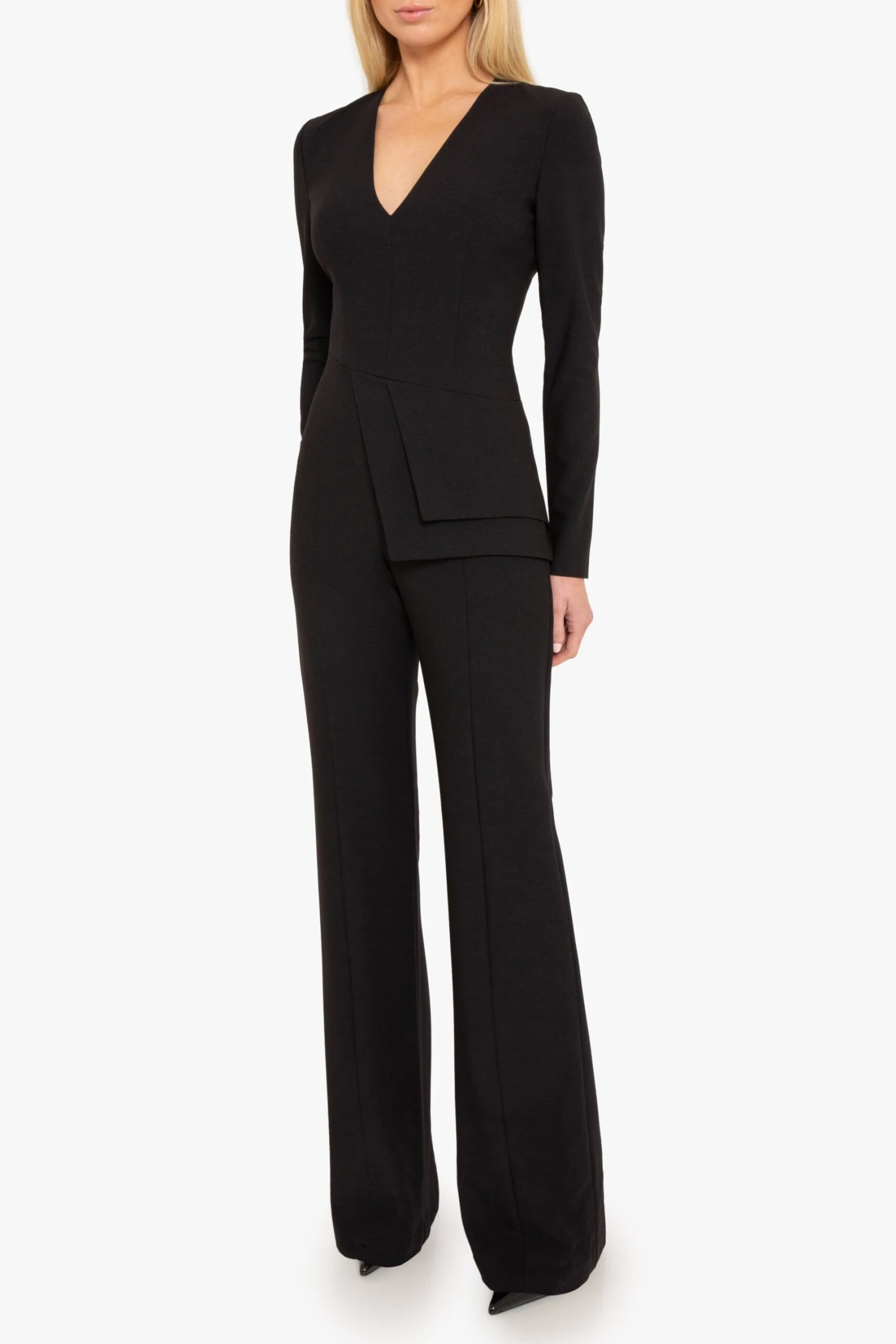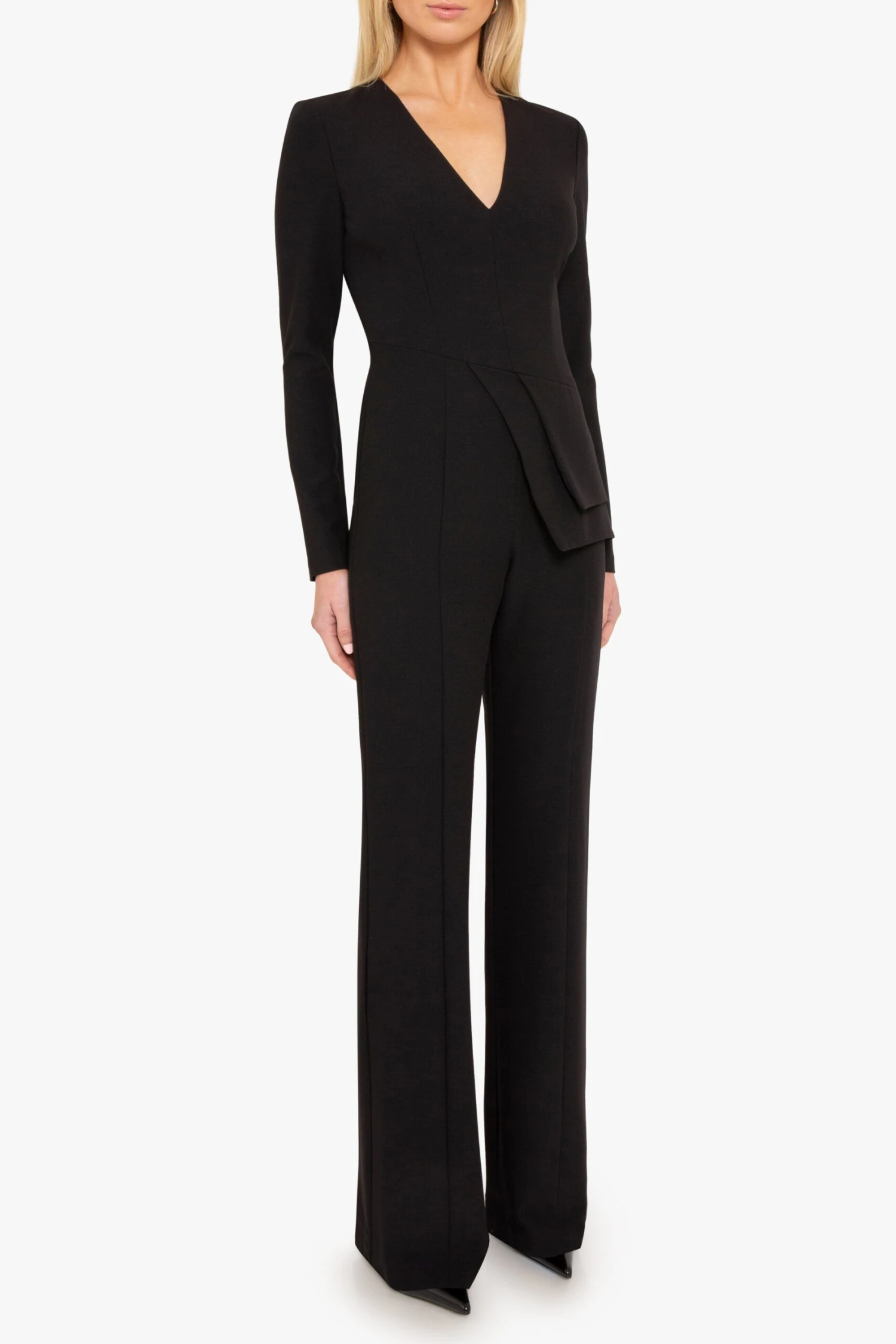 A sophisticated jumpsuit with a tailored fit and modern details. Featuring a flattering V-neckline, long sleeves, and a layered waist design, the style enhances your silhouette effortlessly. The wide-leg pants and stretch fabric ensure comfort and elegance for any occasion.