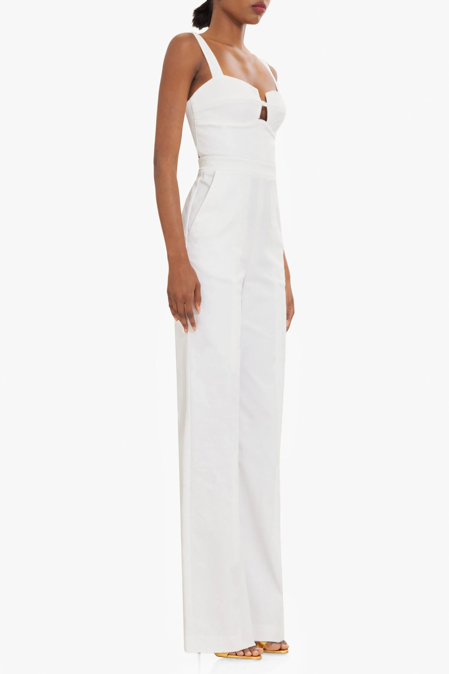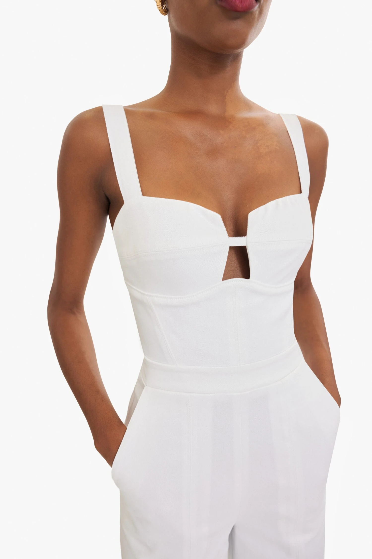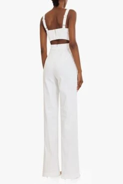 The Sorelle Jumpsuit is crafted from crisp white denim, this jumpsuit blends structure and ease with thoughtful details throughout. The bodice features a sweetheart neckline with a modern cutout and wide shoulder straps, creating a flattering silhouette. High-waisted straight-leg pants elongate the figure, with a subtle cutout at the back waist. Finished with tonal topstitching and a hidden zipper closure, it’s a confident look designed for movement and presence.