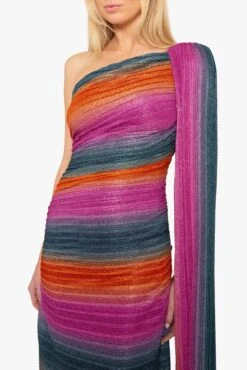Make an entrance in the Vella Gown. This asymetrical one-shoulder silhouette drapes effortlessly, featuring a pleated texture that enhances its multicolor design. A built-in cape detail cascades from the shoulder, adding movement to the sleek column fit.