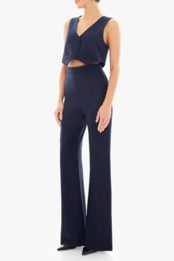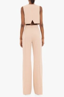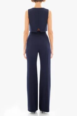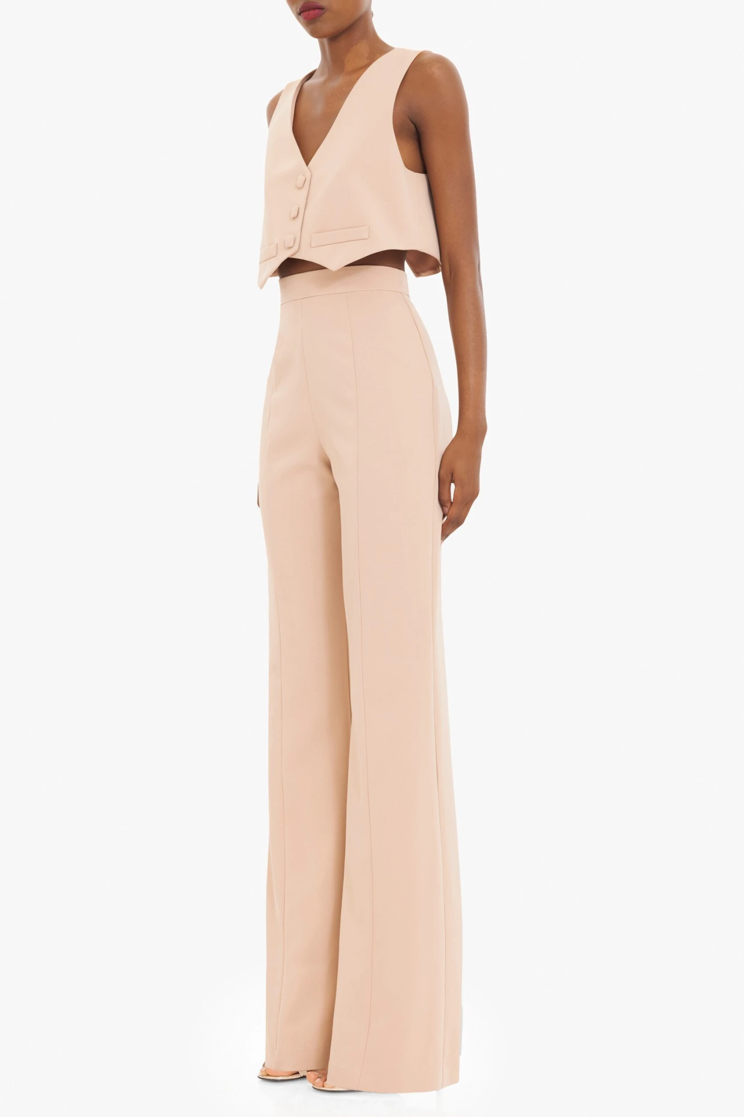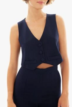 This structured two-piece set brings a modern edge to tailored dressing. The cropped vest features a V-neckline, front self-covered square buttons, and faux welt pocket detailing for a refined finish. Paired with high-waisted straight leg pants, designed with princess seams to elongate the frame, the look strikes a confident balance between sharp and minimal. The back slit of the vest adds a subtle point of interest while keeping the silhouette light and contemporary.