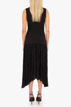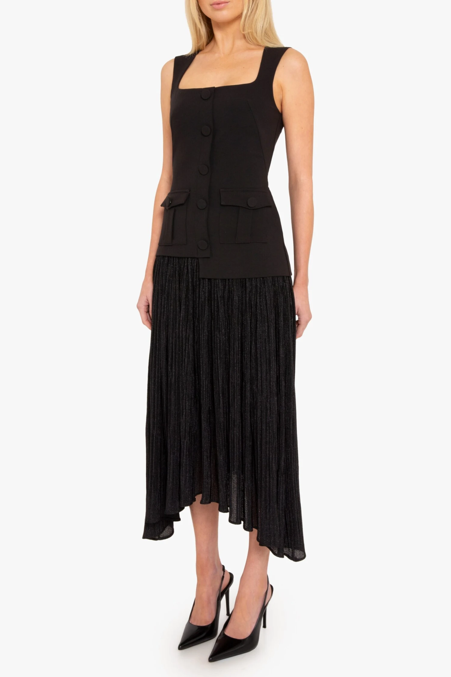 The Vianey Midi Dress creates a structured yet fluid silhouette with a tailored top and a flowing high-low skirt. The fitted bodice features a square neckline, self-covered button detailing along the center front, and functional box pleat pockets for a refined touch. The skirt contrasts beautifully with a shimmering pleated fabric and an asymmetrical high-low hem, adding movement and dimension to the look.